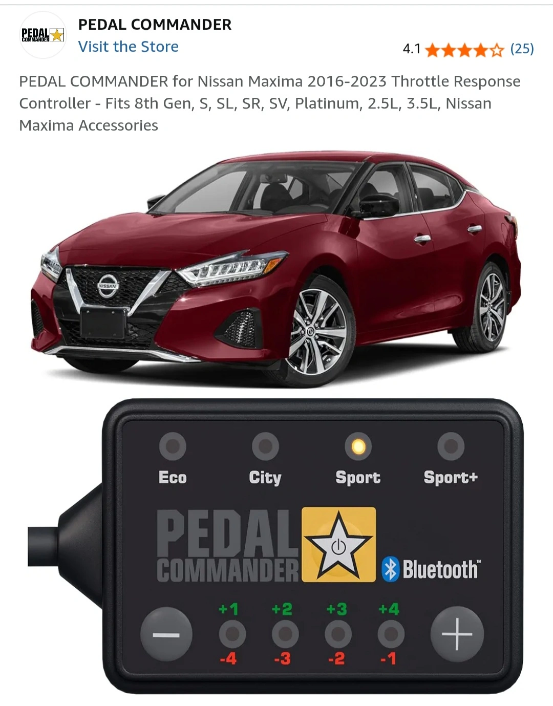 20Selling a Pedal Commander for Nissan Maxima 2016-2023 Throttle Response Controller. It fits 8th Gen, S, SL, SR, SV, Platinum, 2.5L, 3.5L, Nissan Maxima Accessories. It has Eco, City, Sport, and Sport+ modes and Bluetooth connectivity