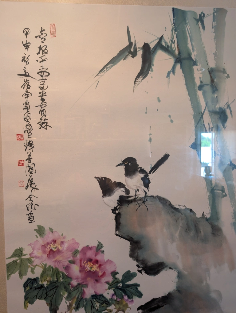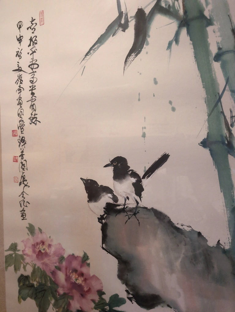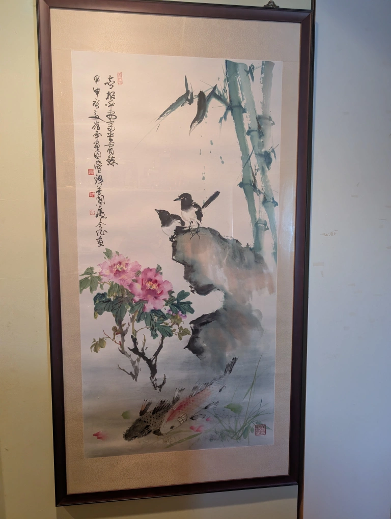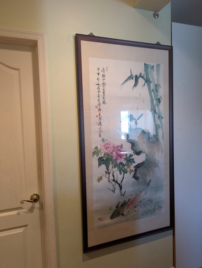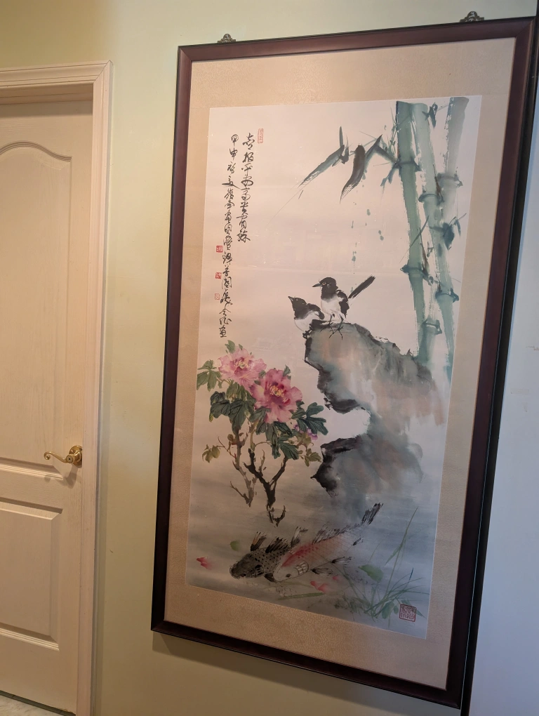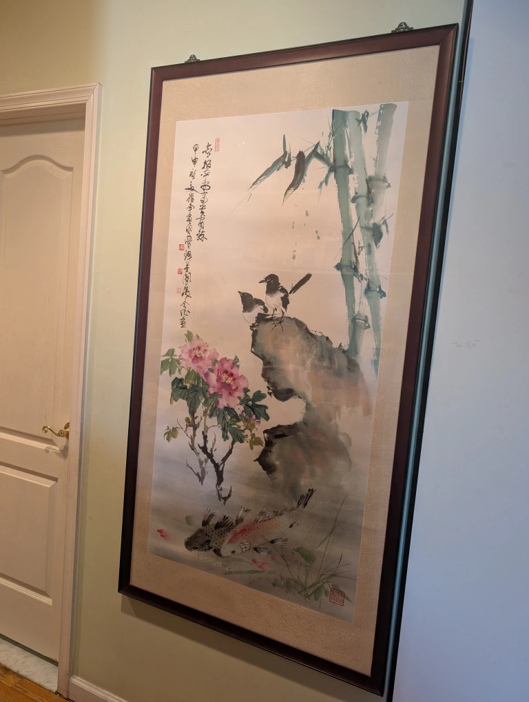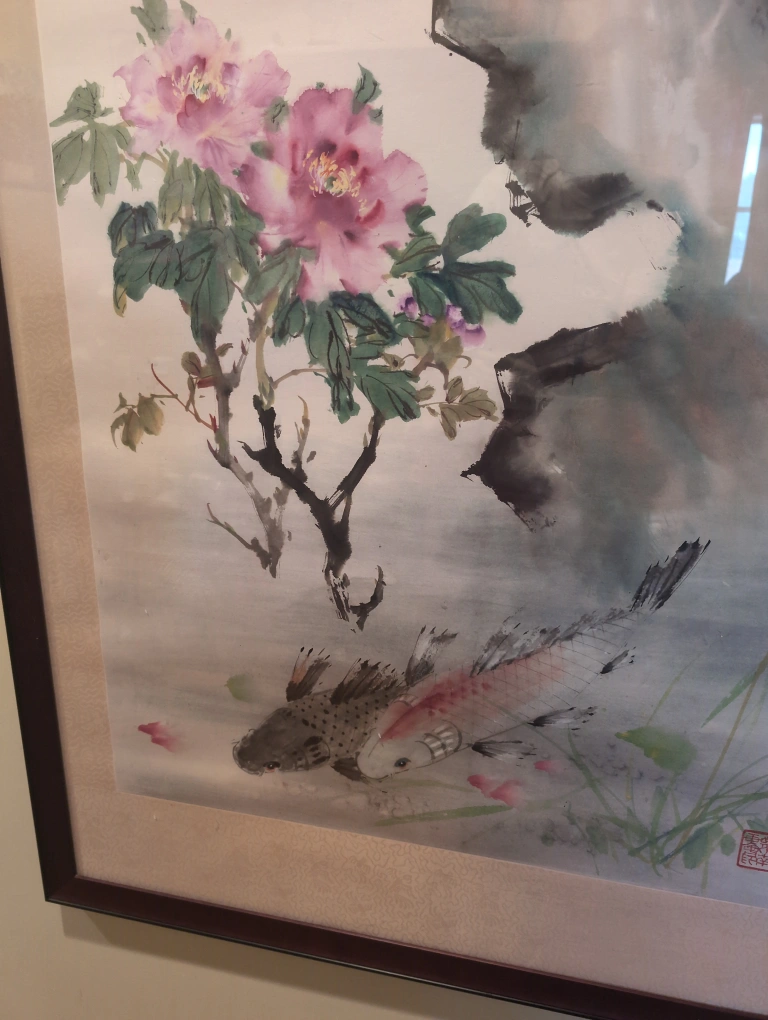 Pick up in Brooklyn in Dyker Heights, 11228. This painting is in excellent condition. A cherished family gift that has been admired for 20 years, it beautifully depicts two birds perched on a rock amidst blossoming flowers and bamboo, with two large fish gracefully swimming below. The artwork is further enhanced by elegant calligraphy. It's presented in a beautiful, professional wooden frame measuring 1" deep, 34 3/8" wide, and 65 1/2" long (approximately 2 ft 10 in x 5 ft' 5.5 in). Due to downsizing, I'm ready to find a new home for this beloved piece.