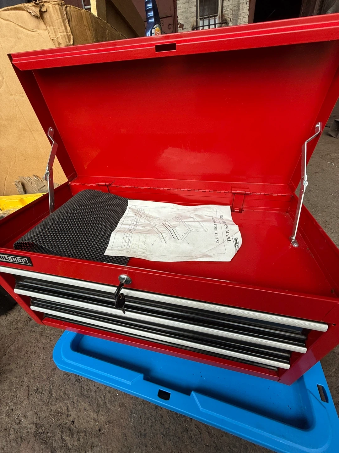 Here's a red TOOLSHOP tool chest! It has multiple drawers for organizing your tools and equipment. Perfect for a garage or workshop!