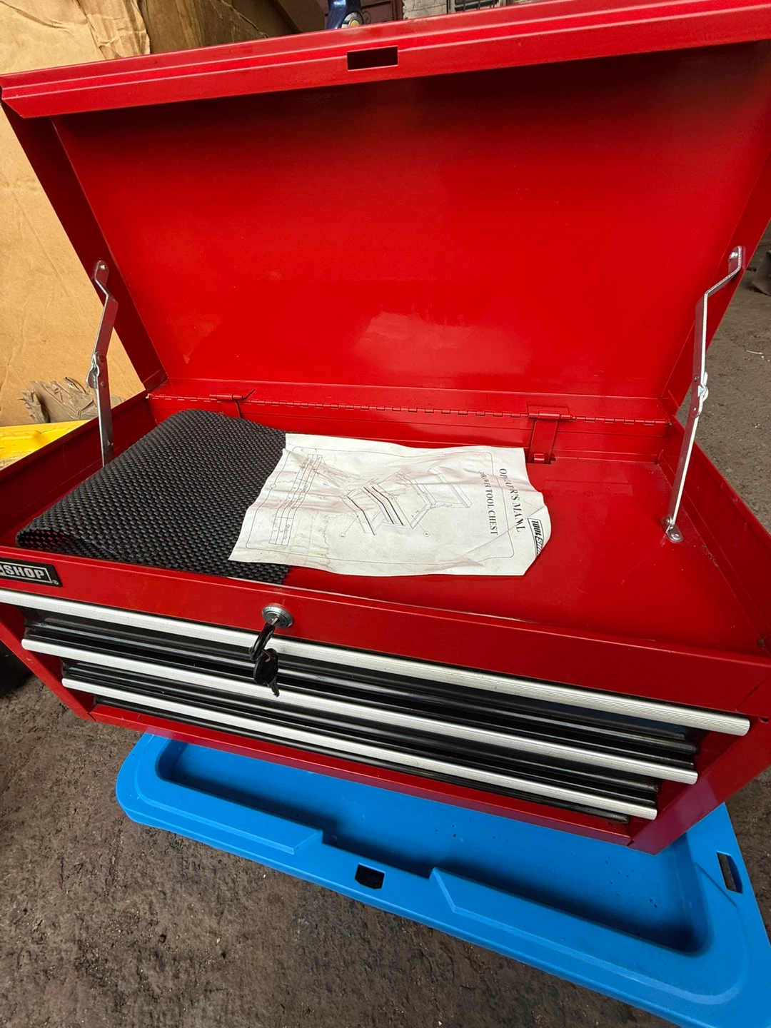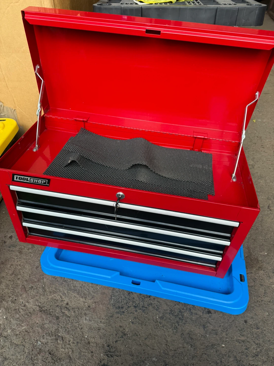 Here's a red TOOLSHOP tool chest! It has multiple drawers for organizing your tools and equipment. Perfect for a garage or workshop!
