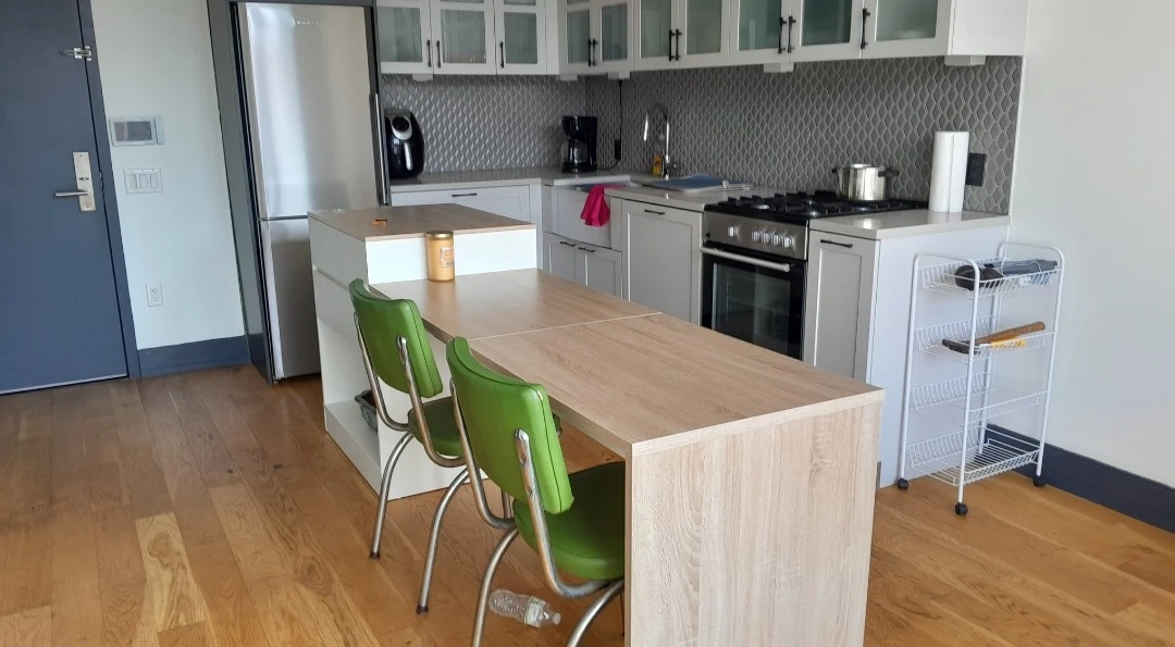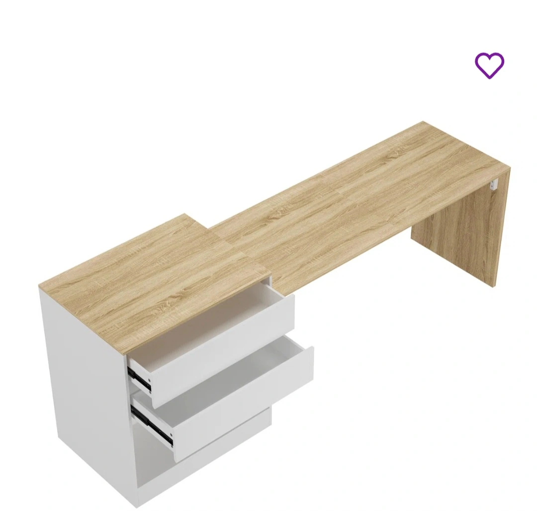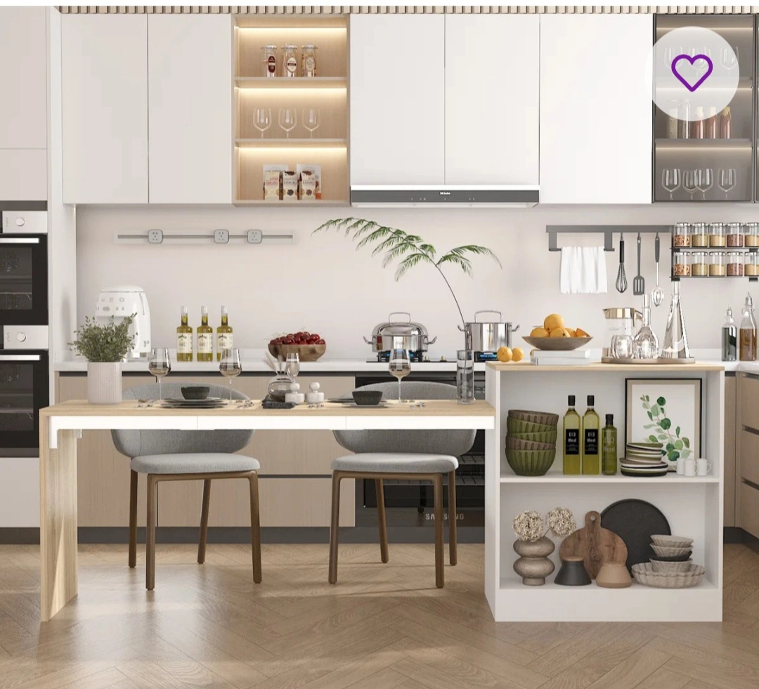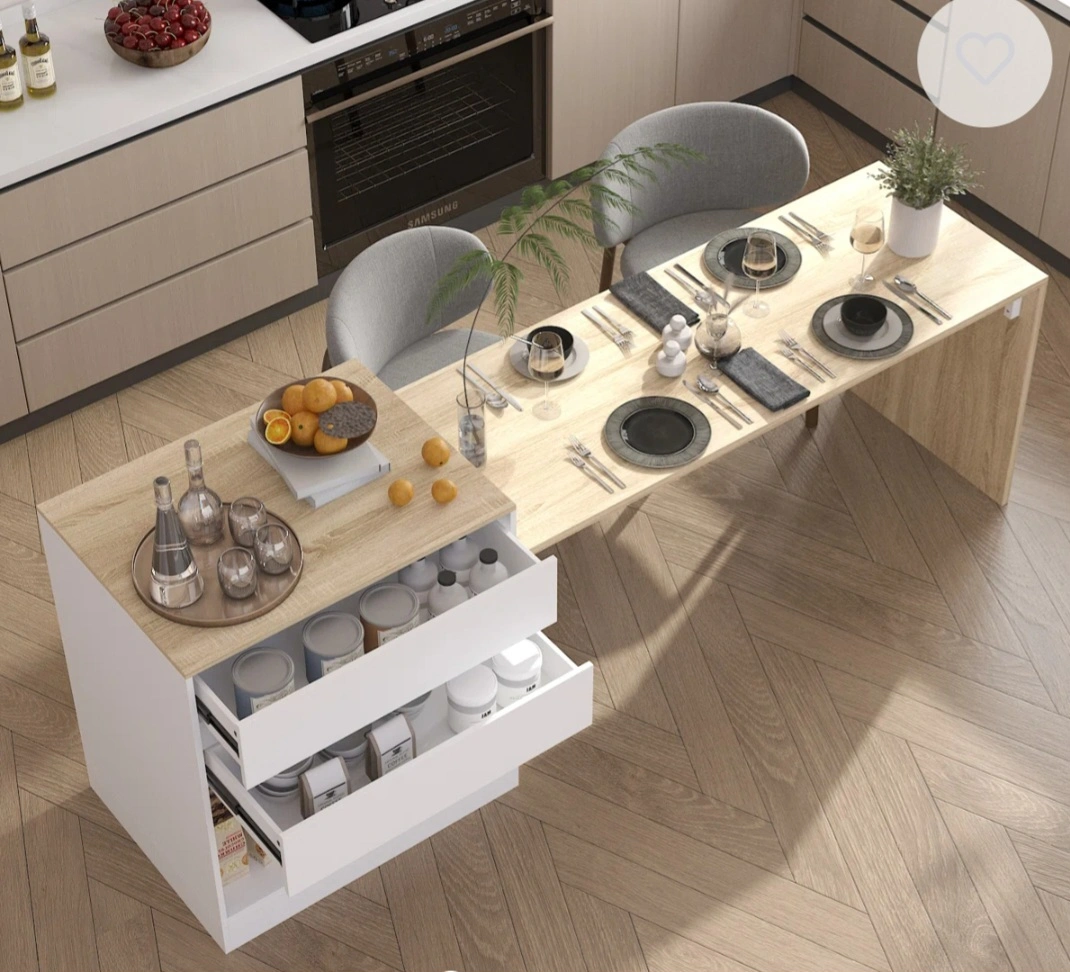 This kitchen island features a clean white base with a light oak countertop, offering a modern look. It includes drawers for convenient storage. Perfect for dining table. sits 4 very comfortable adding extra workspace and organization to your kitchen