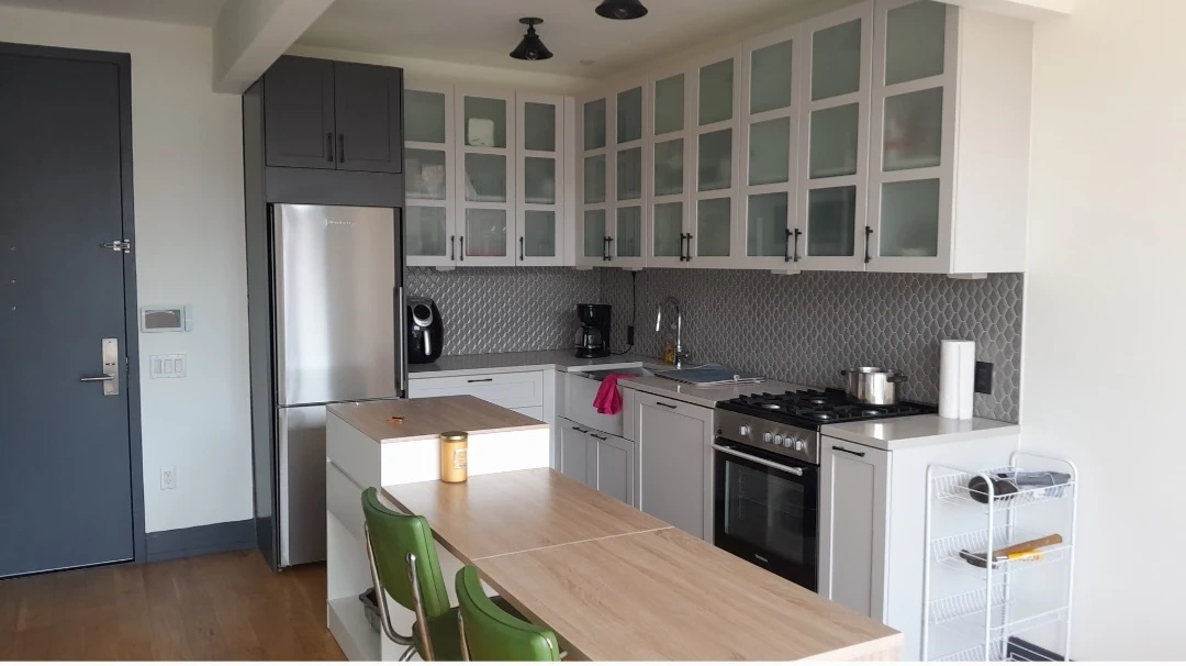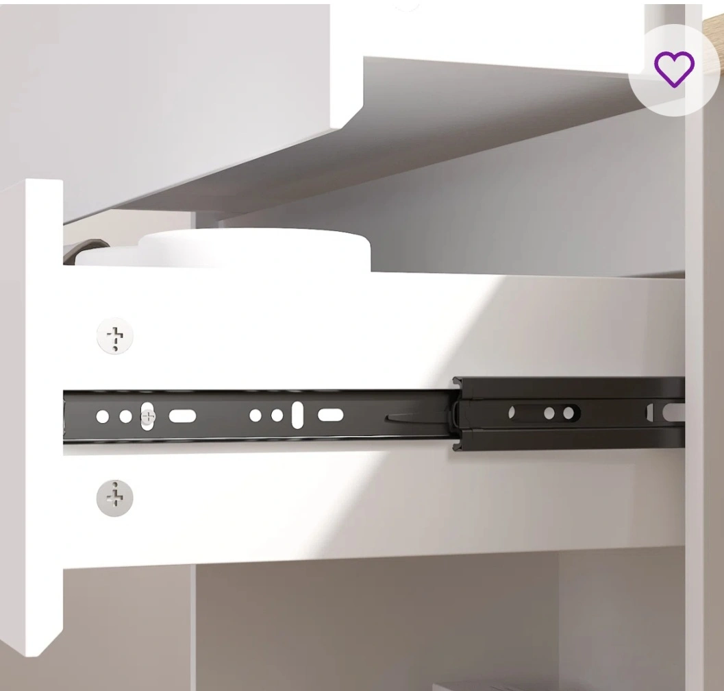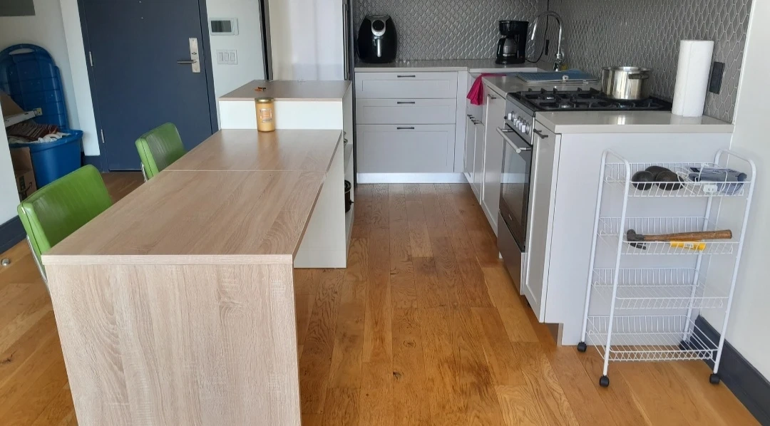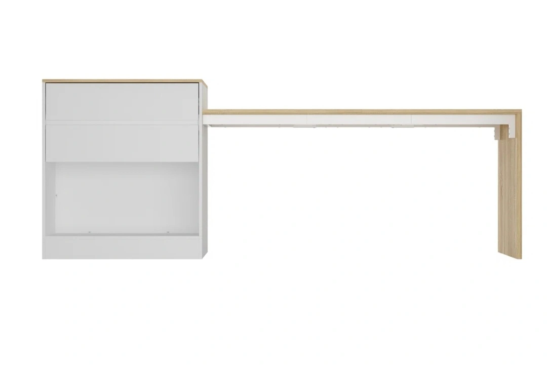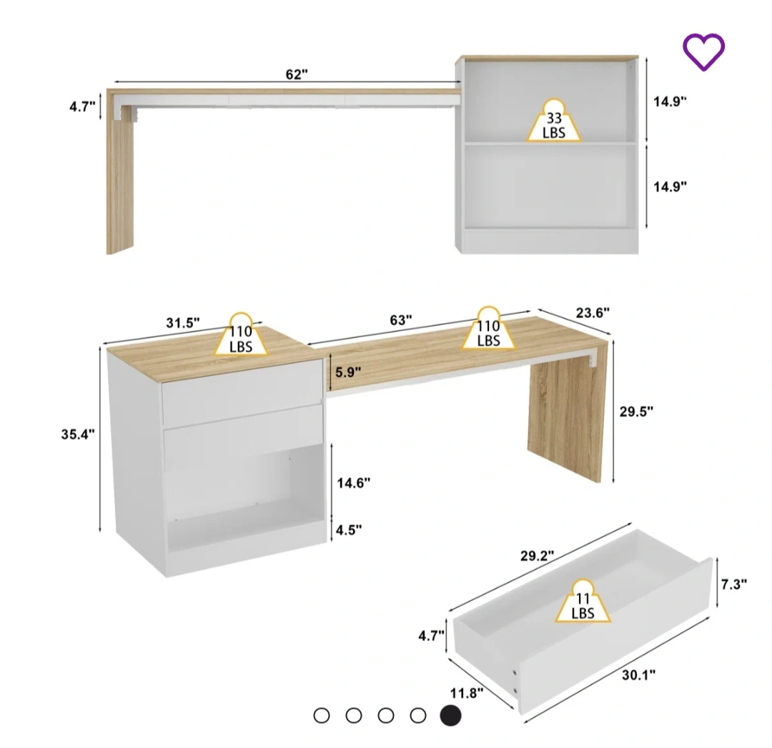 This kitchen island features a clean white base with a light oak countertop, offering a modern look. It includes drawers for convenient storage. Perfect for dining table. sits 4 very comfortable adding extra workspace and organization to your kitchen