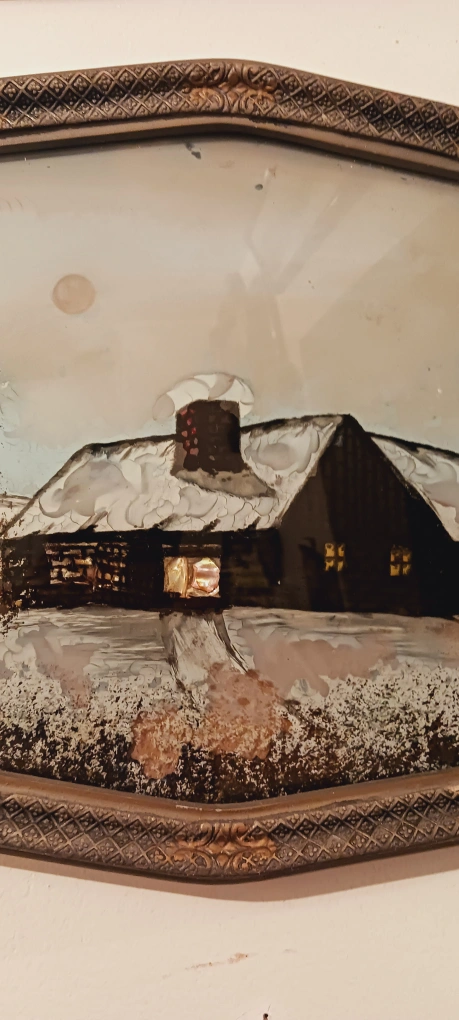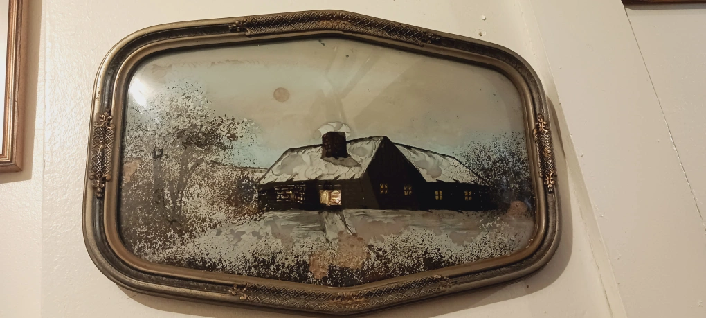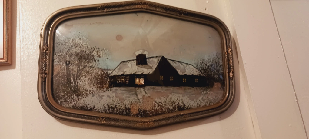 Gorgeous Antique Convex Bubble Glass Framed Artwork. This is a beautiful antique painting. It features a winter scene with a house and trees. The frame is ornate and adds to the vintage charm of the piece. It's a unique item that would look great in any home. 16"×11". Good vintage condition. ALL MY PRICES ARE NEGOTIABLE !!