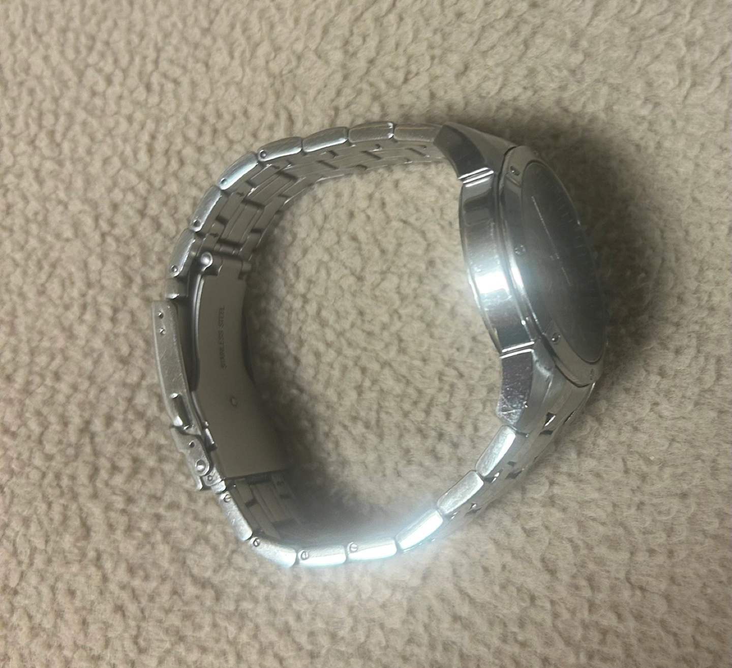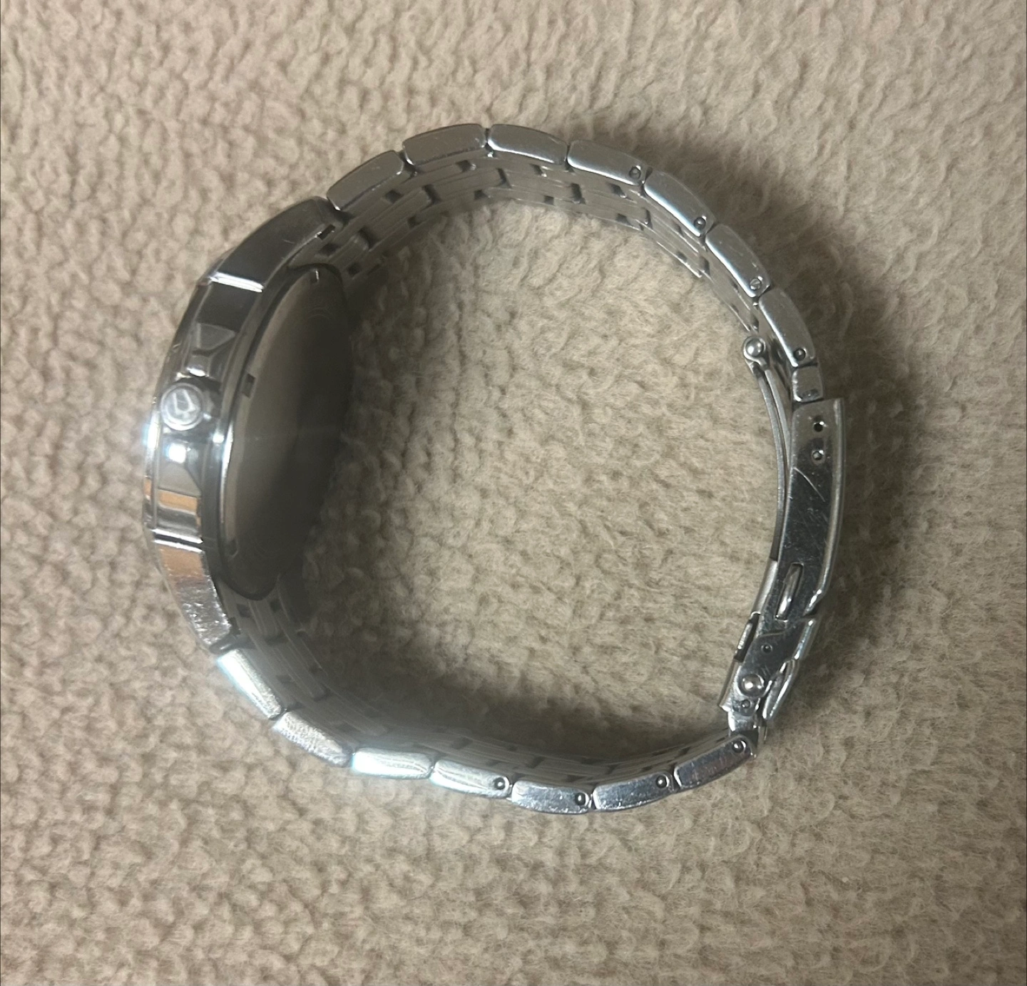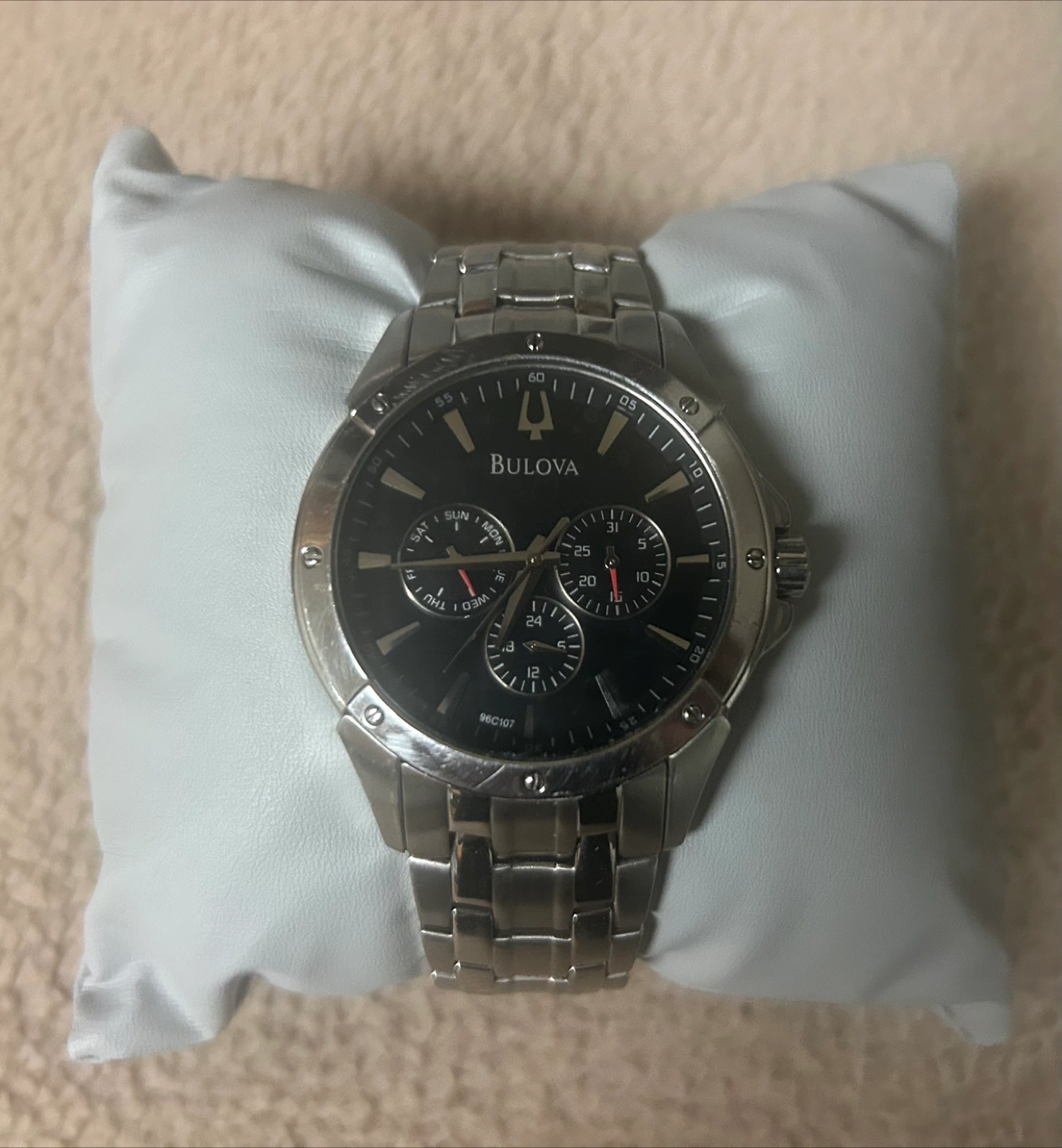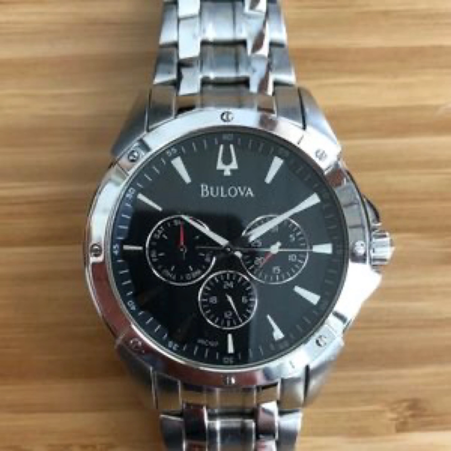 Selling a Bulova men's watch with a silver band and black face. It's in great condition and has a chronograph feature. The watch has a classic and stylish look!