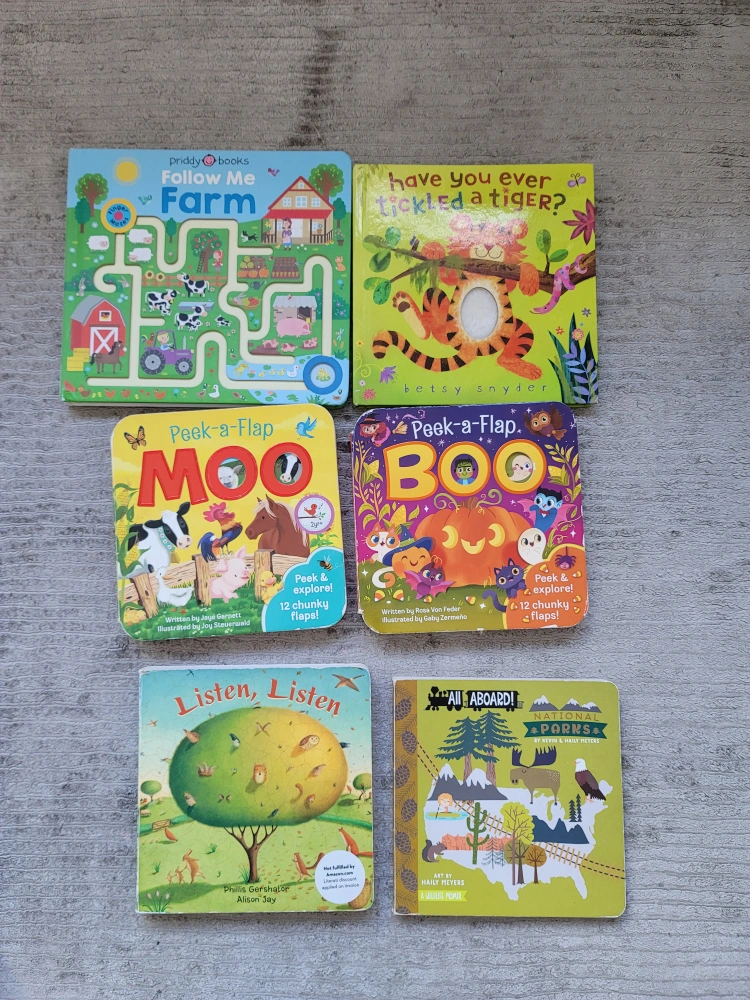 Selling a set of gently used kids' board books! Includes: - Priddy books Follow Me Farm - Have you ever tickled a tiger? by Betsy Snyder - Peek-a-Flap Moo - Peek-a-Flap Boo - Listen, Listen by Phillis Gershator and Alison Jay - All Aboard! National Parks by Kevin & Haily Meyers These books are perfect for little hands and feature chunky flaps and interactive elements