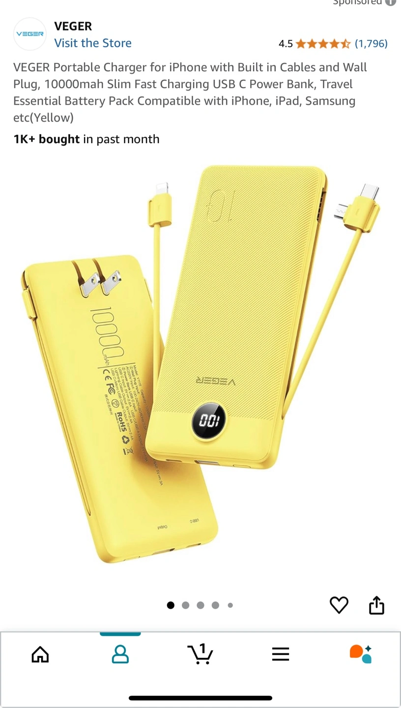 Selling a VEGER 10000mAh powerbank, model V1115! It's a portable charger for iPhones and other devices with built-in cables and a wall plug. This slim, fast-charging USB-C power bank is perfect for travel. The box is included!