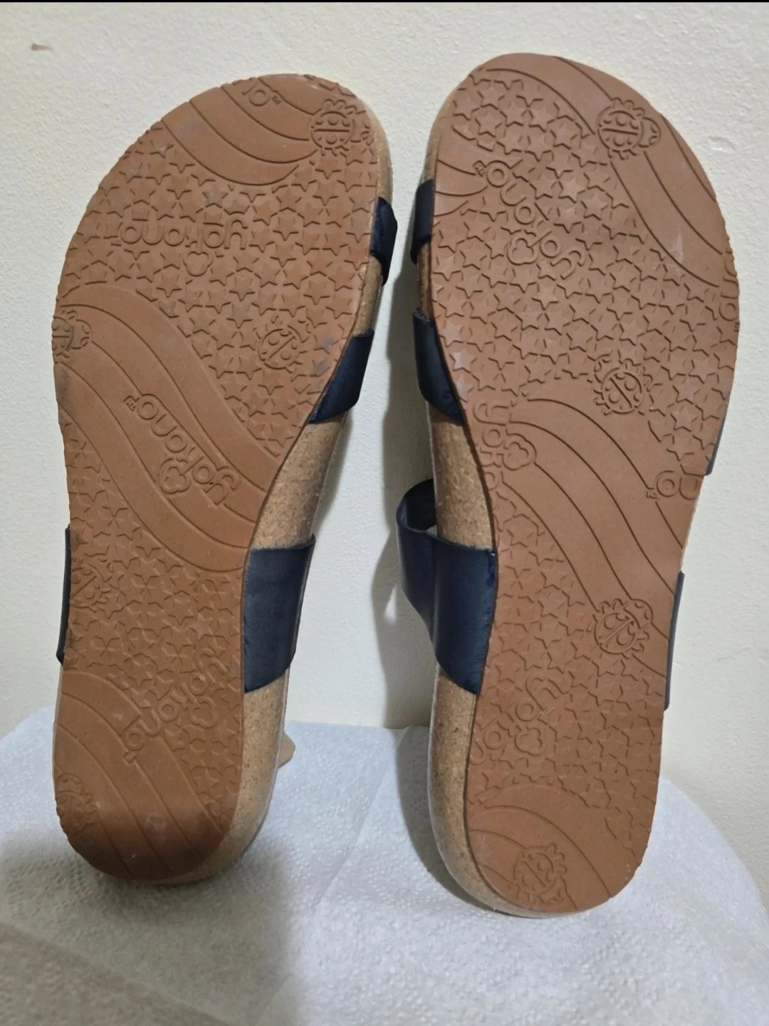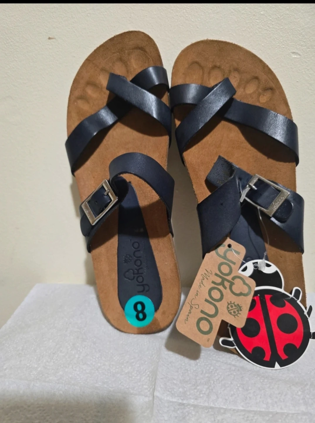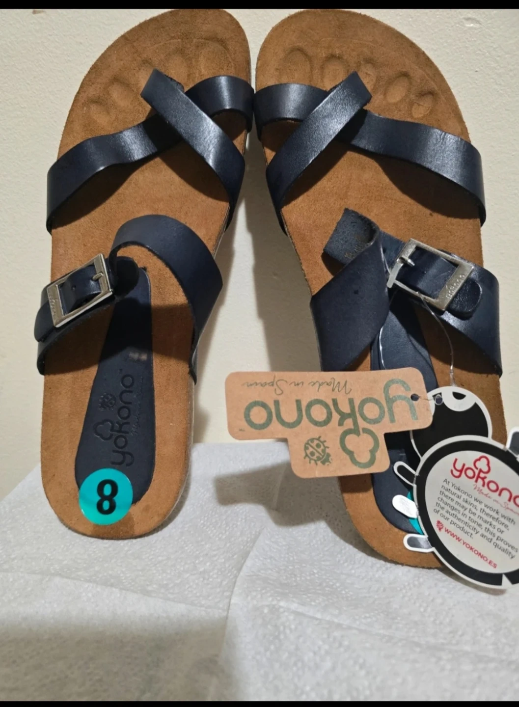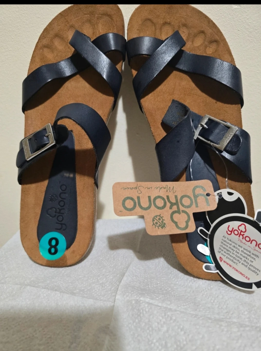 High-quality comfort sandals from the Spanish brand Yokono. These are brand new, never worn, but do not include the oriqinal box (NWOB). The original retail price was $24.00. They are a size 8 in black, Made in Spain with quality materials, featuring leather straps and a molded cork footbed that forms to your foot. They are incredibly comfortable, perfect for summer, walking, or everyday