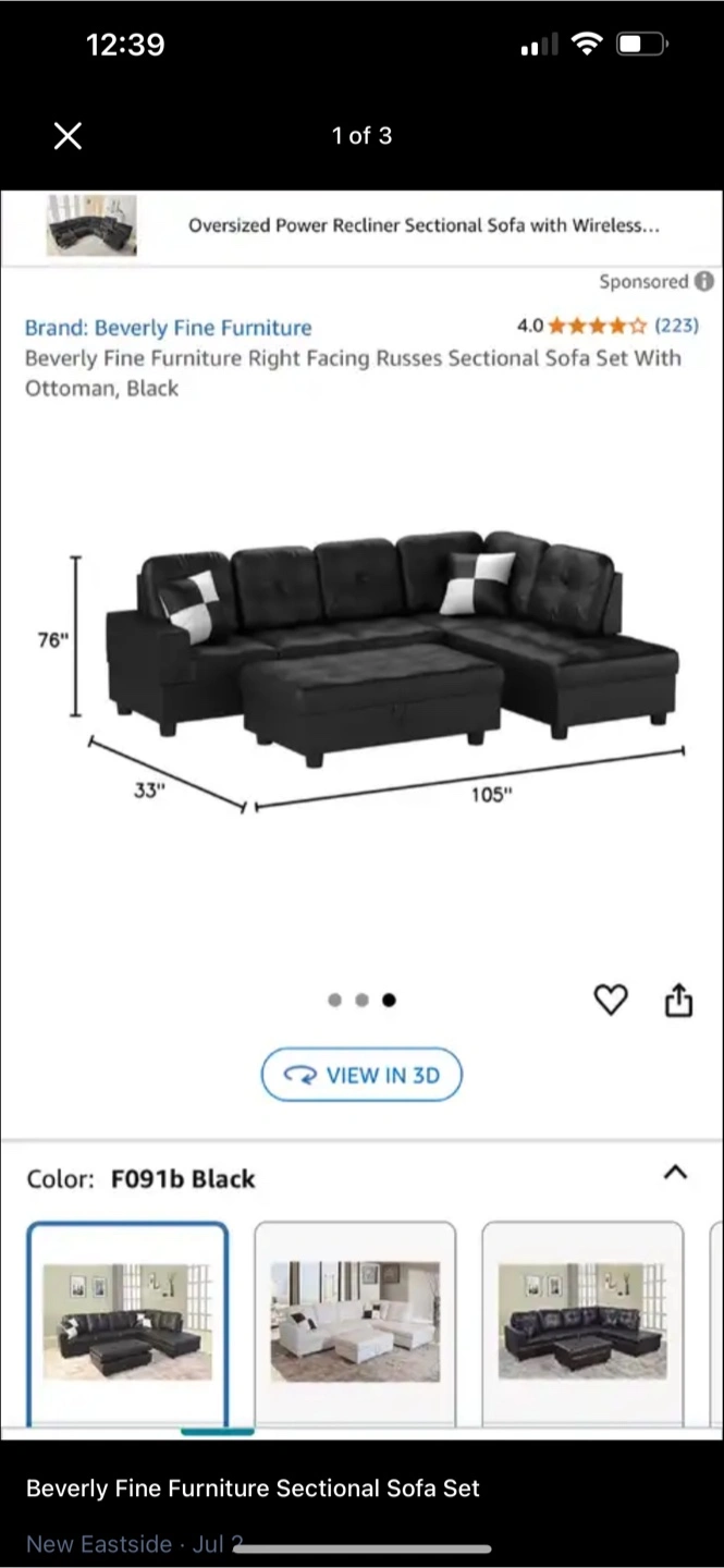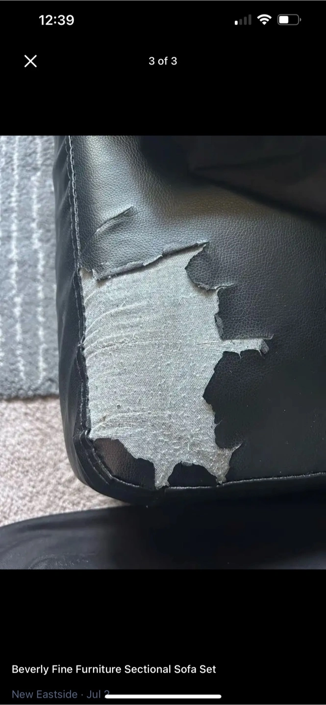 Beverly Fine Furniture sectional sofa set in black. Please note that the sofa has significant damage as shown in the pictures.
