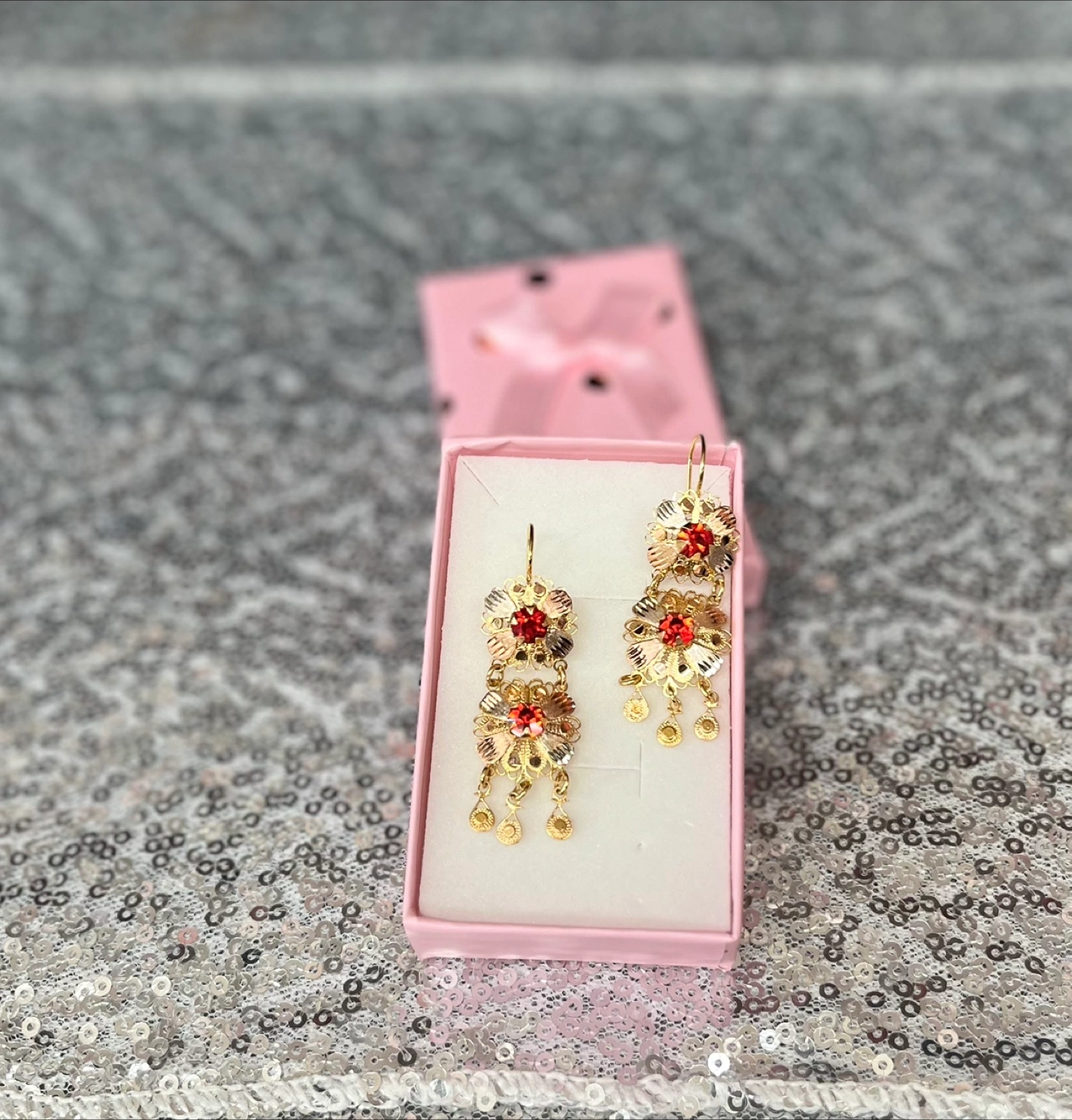 65Beautiful real gold 10k dangle earrings with a flower design and small red stones. They come in a cute pink box, perfect for gifting or keeping them safe