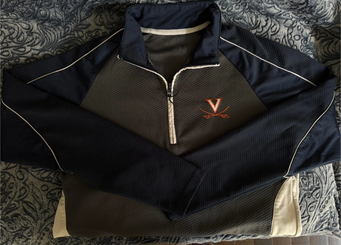 25Here's a men's 1/4 zip pullover featuring the University of Virginia logo! It's in great condition and perfect for showing your school spirit. The pullover is a mix of navy and gray with a textured pattern on the main body and sleeves
