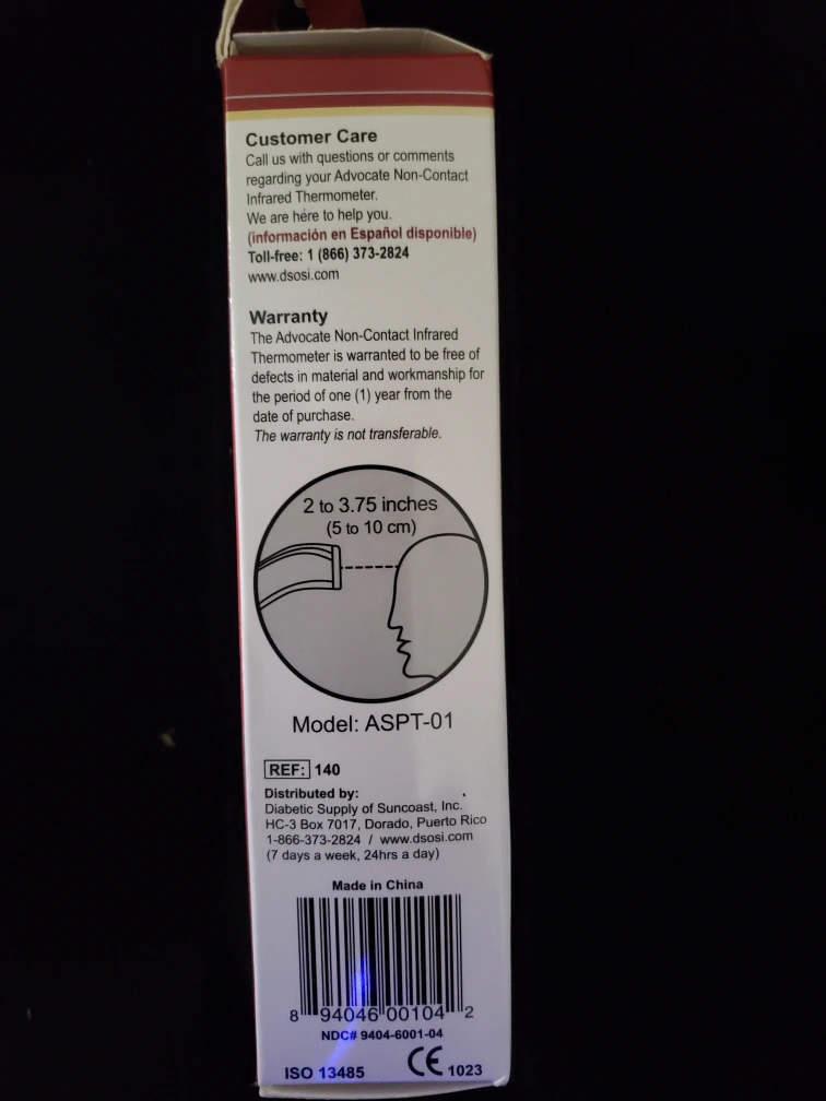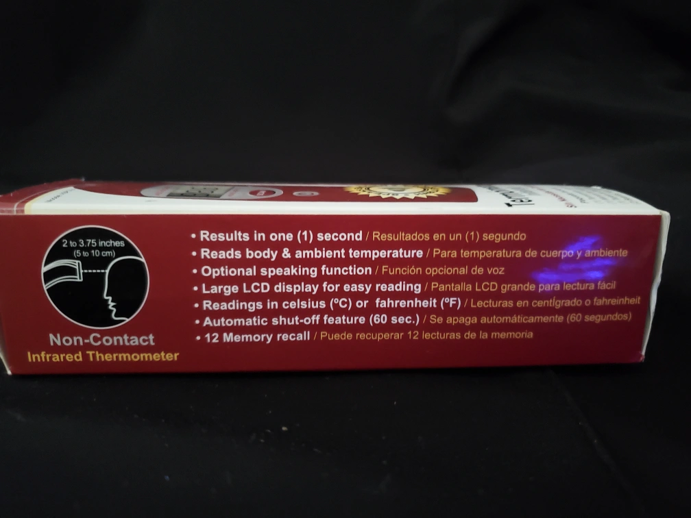 I'm selling an Advocate Non-Contact Infrared Thermometer, model ASPT-01. It features: - Results in one second - Reads body and ambient temperature - Optional speaking function (speaks English and Spanish) - Large LCD display for easy reading - Readings in Celsius or Fahrenheit - Automatic shut-off feature (60 sec) - 12 Memory recall Package contains: - Infrared Thermometer - Owner's Manual - Warranty Card - (2) AAA Alkaline Batteries