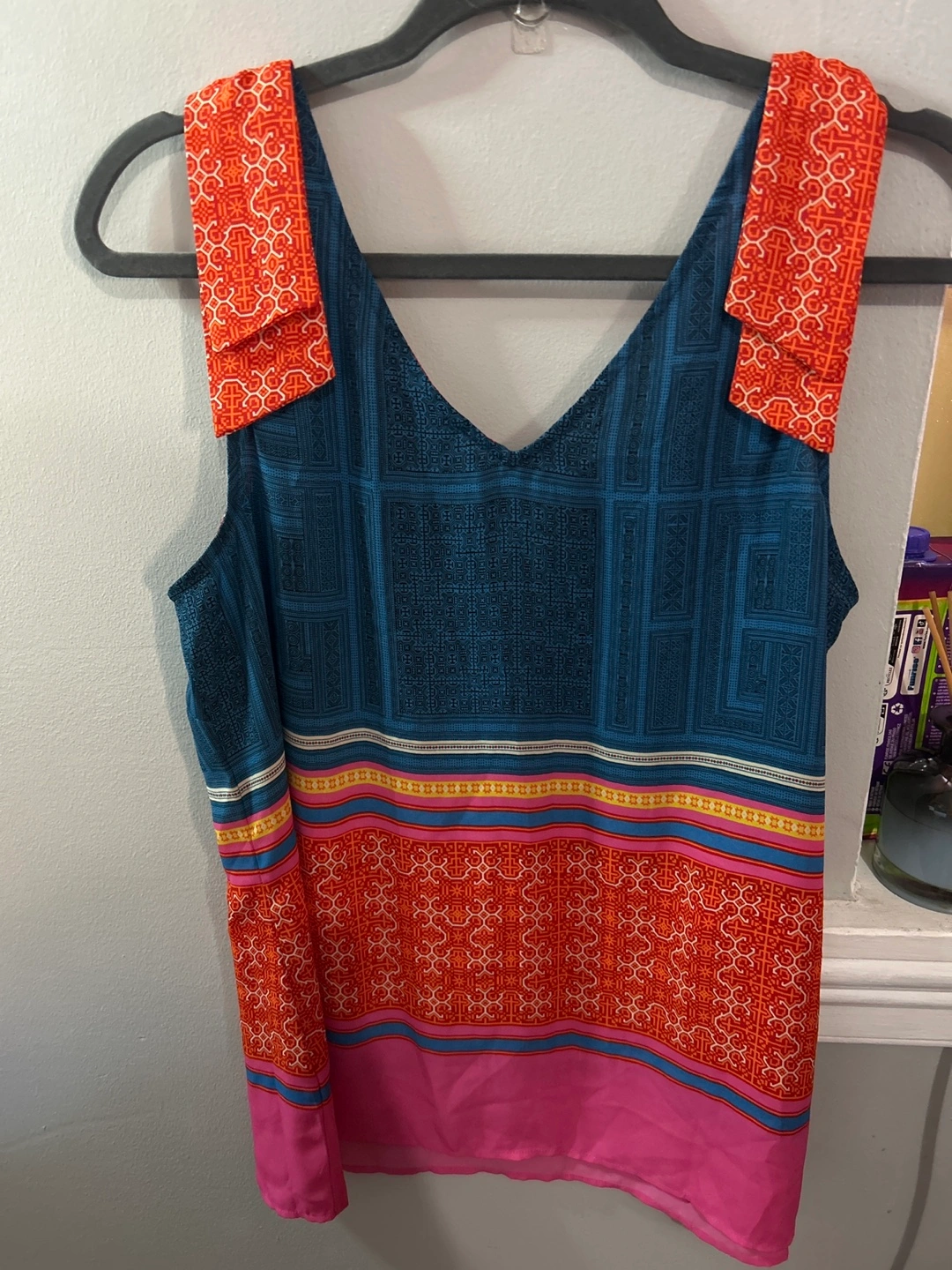 This is a Cabi sleeveless top in size medium. The top features a colorful design with blue, orange, and pink hues. Perfect for a casual and stylish look!