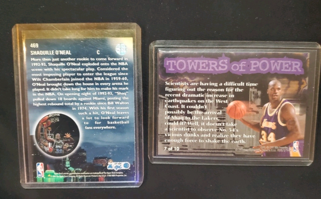 Selling two Shaquille O'Neal basketball cards. One is a 1996-97 Upper Deck Skylights card and the other is a 1997-98 Upper Deck Towers of Power card. Great for any basketball card collector!