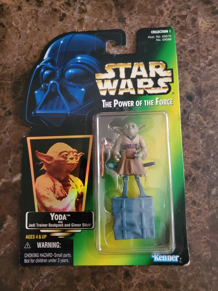 Selling a vintage Star Wars Yoda action figure from The Power of the Force collection! This figure comes with a Jedi Trainer Backpack and Gimer Stick. It's suitable for ages 4 and up. A classic collectible for any Star Wars fan!