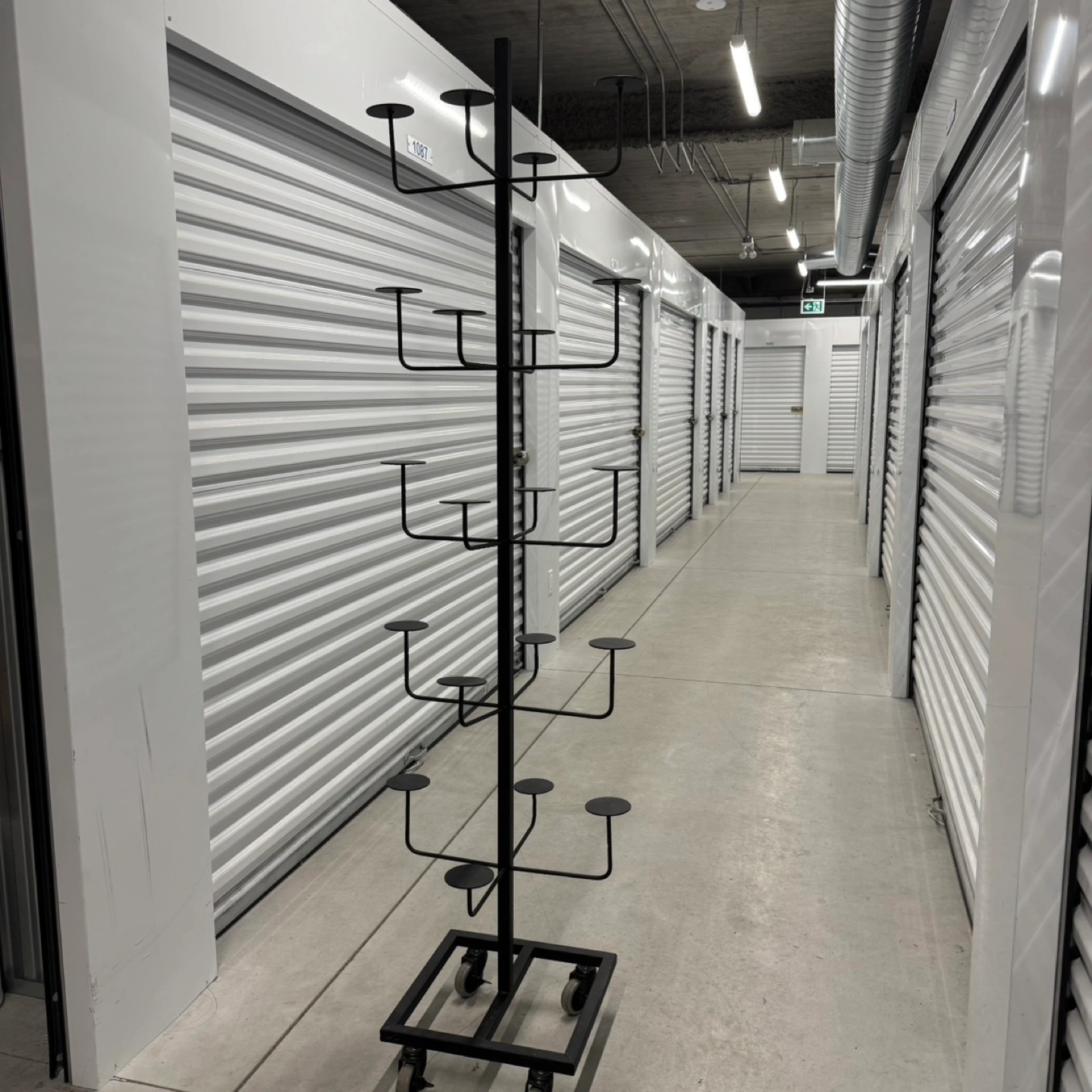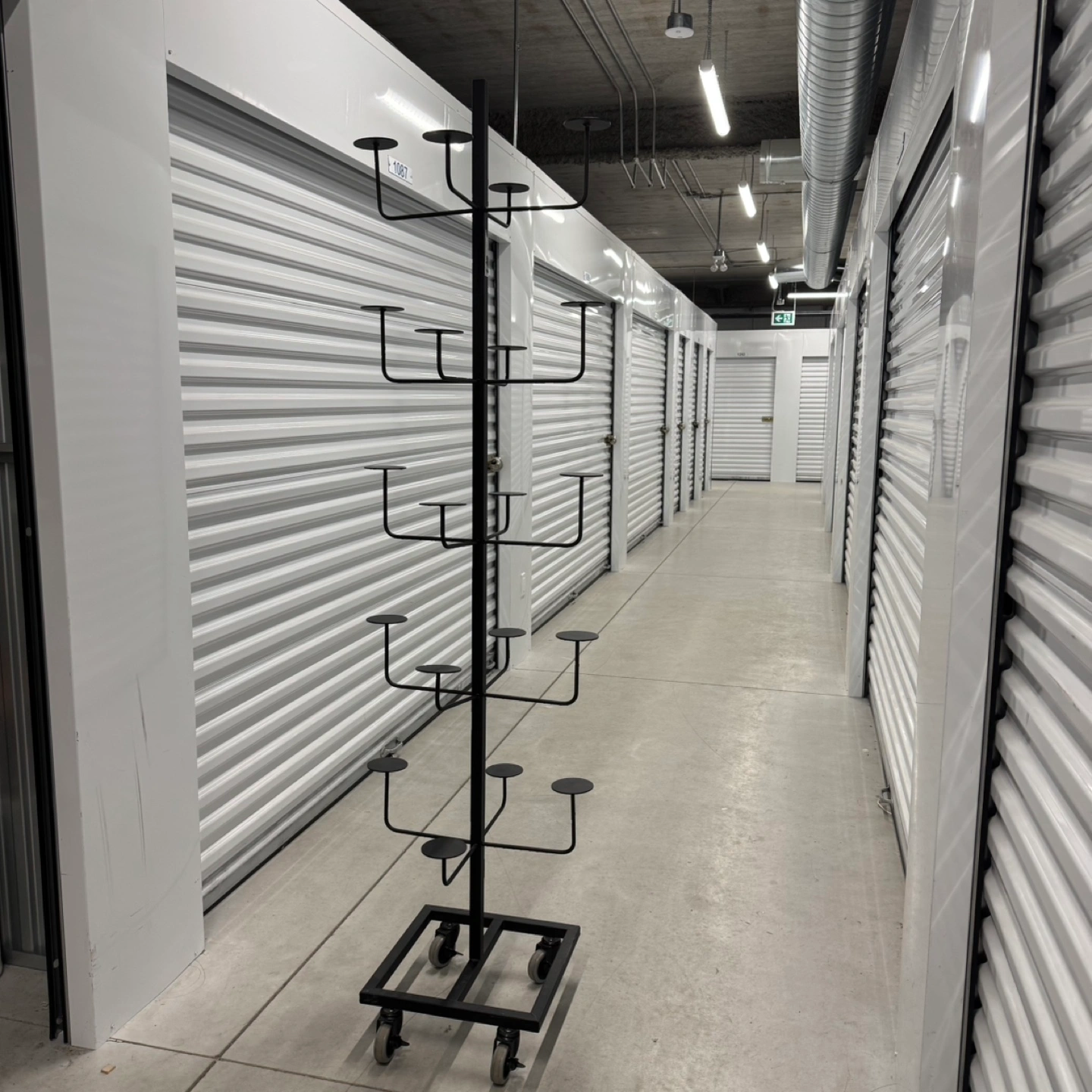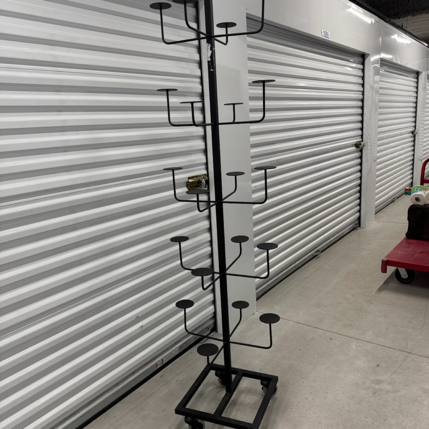 Here's a black metal hat display stand! It's on wheels, so it's easy to move around. The wheels lock too so it will never roll away. Perfect for organizing your hats or displaying them in a store, at a market or pop-up. It displays 20 hats. I really have no place to store it after the end of this month. Make me an offer.