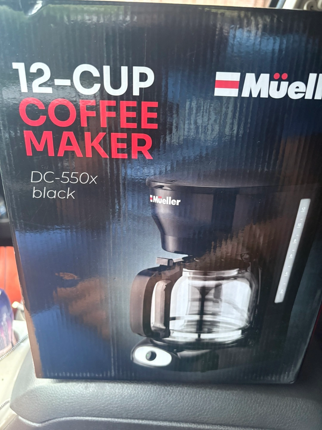 Selling a Mueller 12-Cup Coffee Maker, model DC-550x in black. It features a rich and flavorful brew, a durable permanent filter, and a smart anti-drip system. The clear water level window makes it easy to fill, and the auto keep warm function and 2-hour auto shut-off add convenience. Brew up to 12 cups at a time! Box included