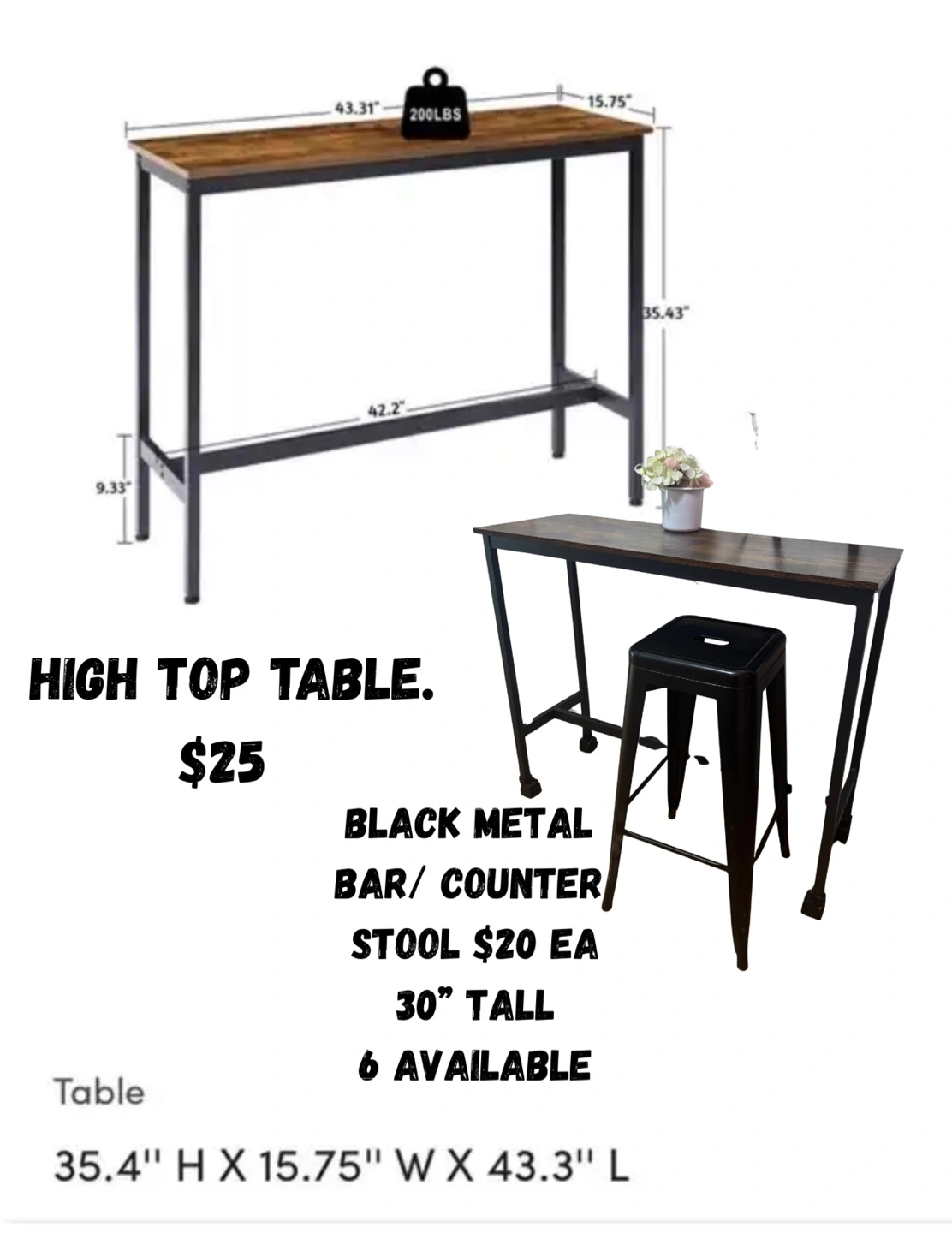 Selling a high top table wood color with a black metal frame $25 Dimensions: - Height: 35.4" - Width: 15.75" - Length: 43.3" Less than 3 years old. Also available are black metal bar/counter stools that are 30" tall. They're $20 each