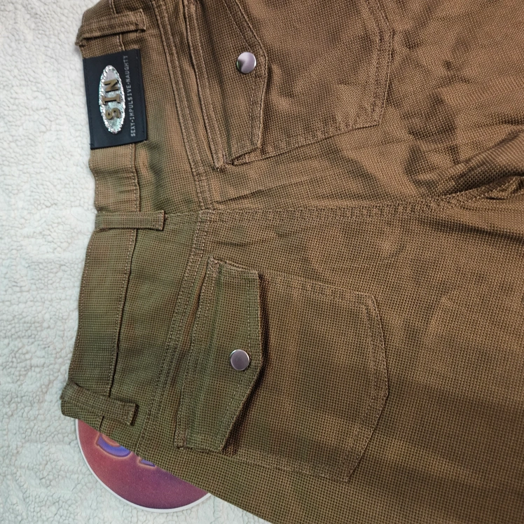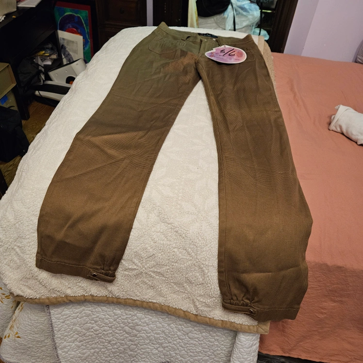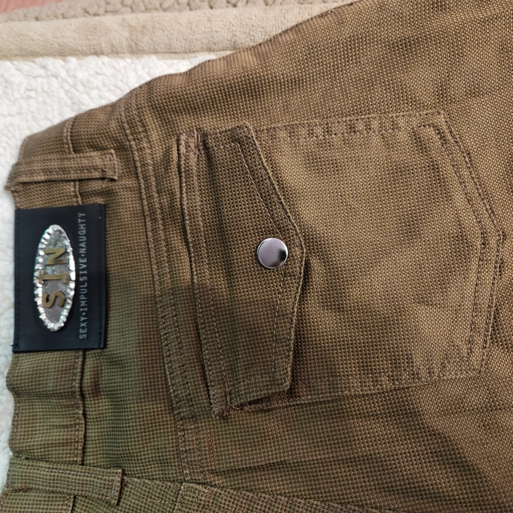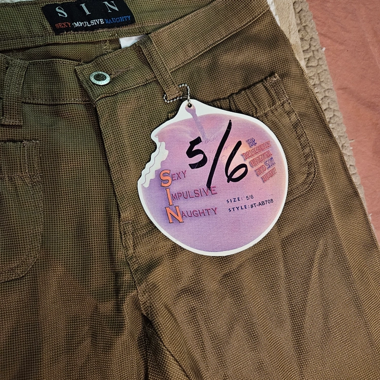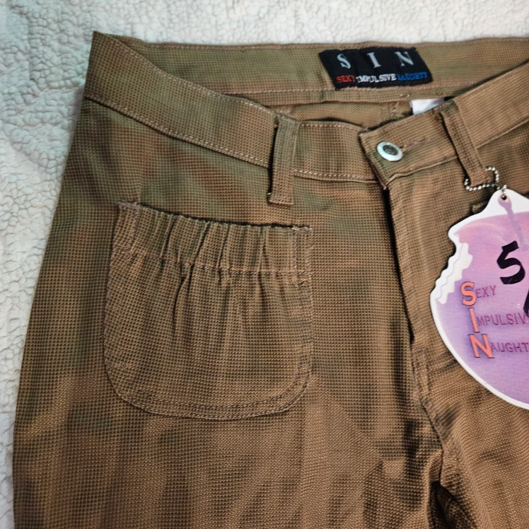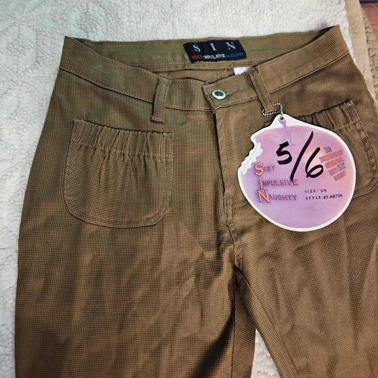 These are a pair of SIN brand pants, labeled as "Sexy Impulsive Naughty". They are a unique brown color and size 5/6. They feature interesting pocket designs.