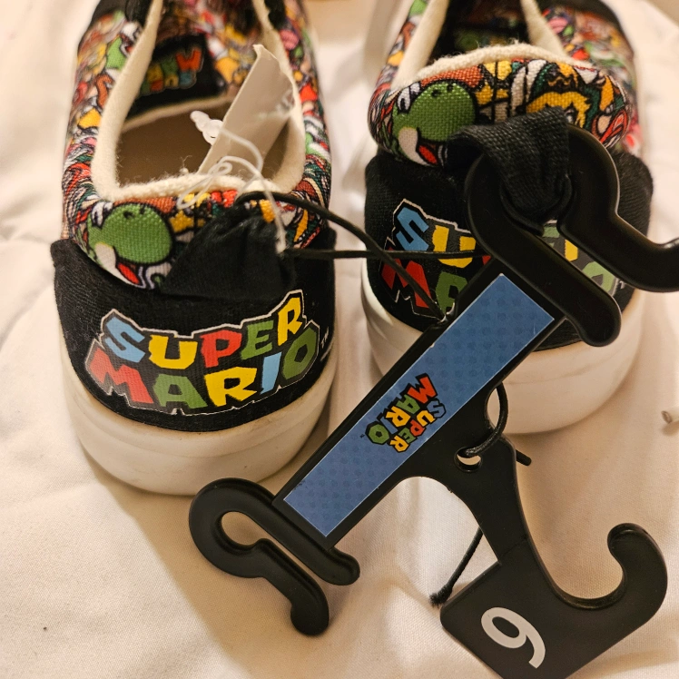 These Super Mario sneakers are brand new with tags! They feature a fun, colorful design with all your favorite characters. Size 6. missing 1 shoe lace.