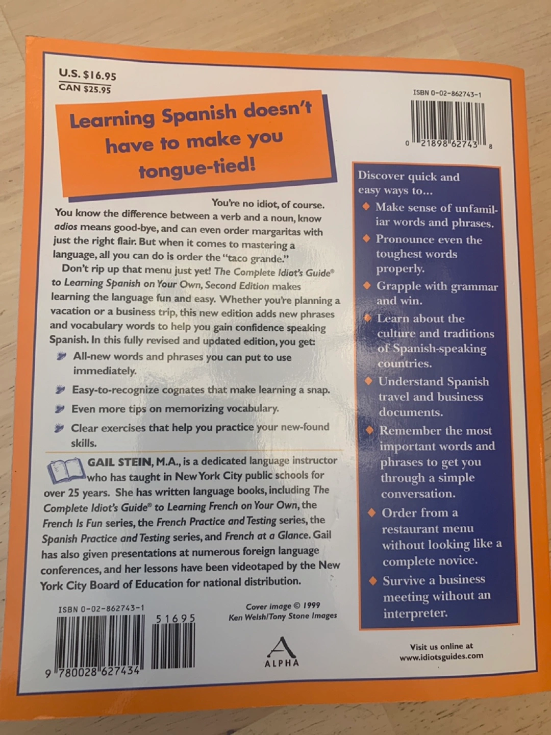65Selling "The Complete Idiot's Guide to Learning Spanish on Your Own," Second Edition by Gail Stein. It's packed with idiot-proof steps to help you speak like a native and quick, easy techniques to learn Spanish like a pro. You'll also find valuable tips to perfect your pronunciation. This brand-new edition is completely revised and updated!