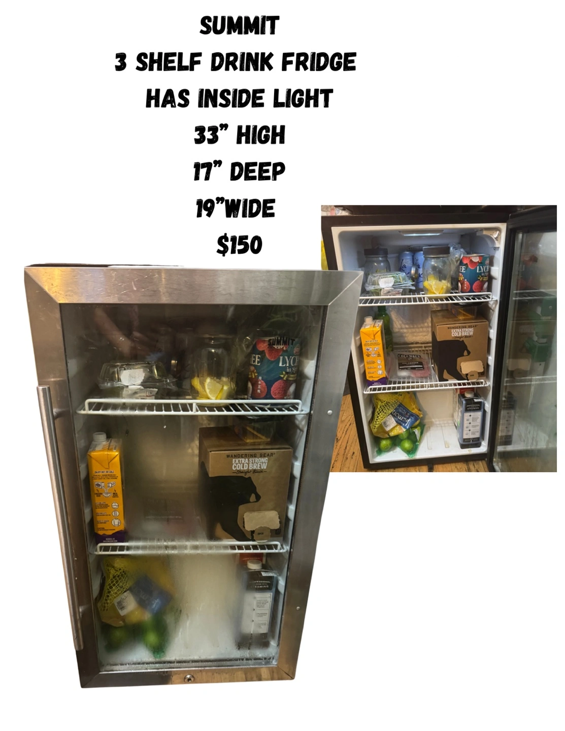 Selling a Summit 3-shelf drink fridge! It has an inside light and measures 33" high, 17" deep, and 19" wide
