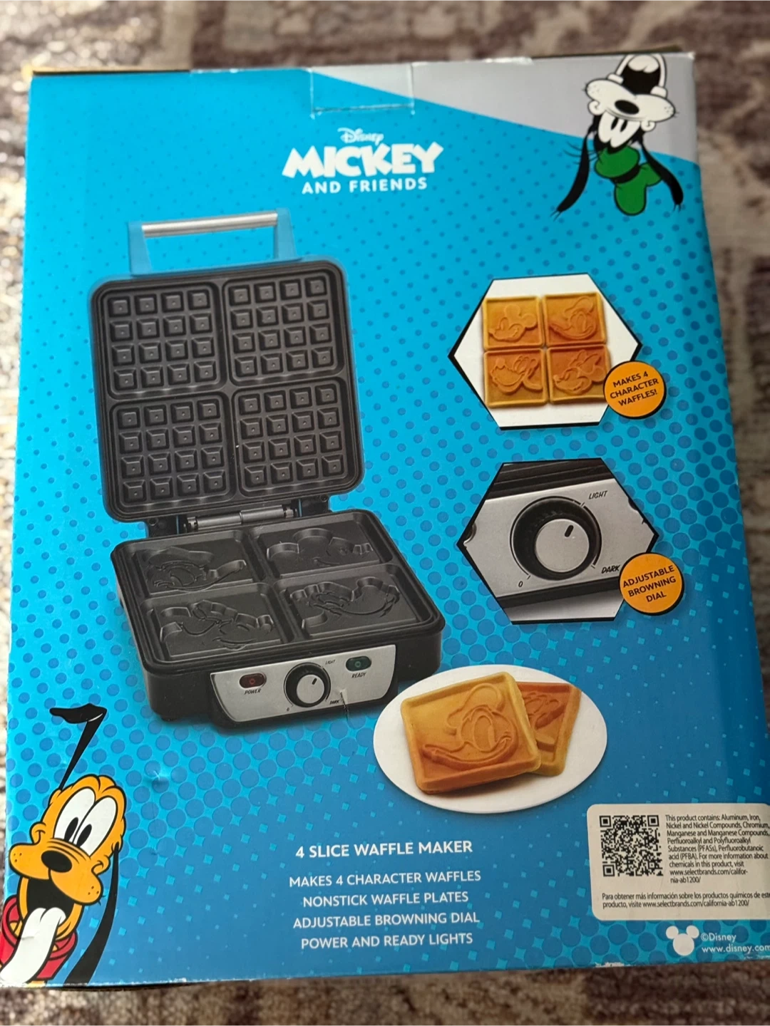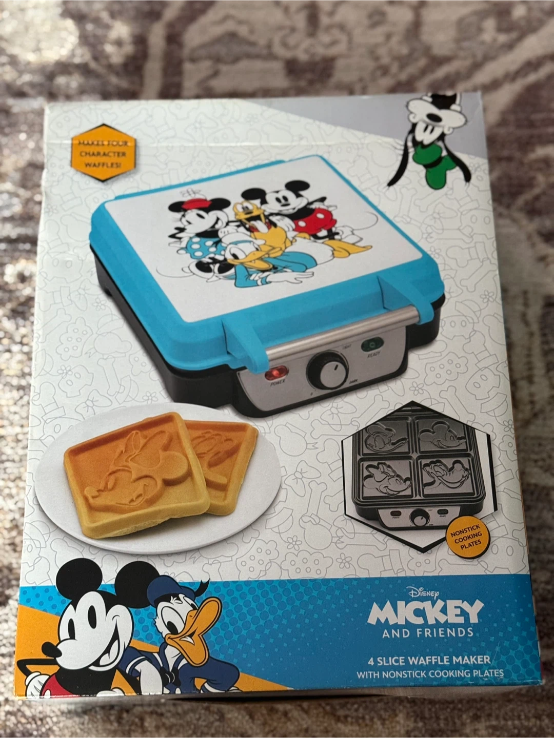 I'm selling a brand new Disney Mickey and Friends 4-Slice Waffle Maker! It makes 4 character waffles with nonstick cooking plates. It also has an adjustable browning dial and power and ready lights. Box included!
