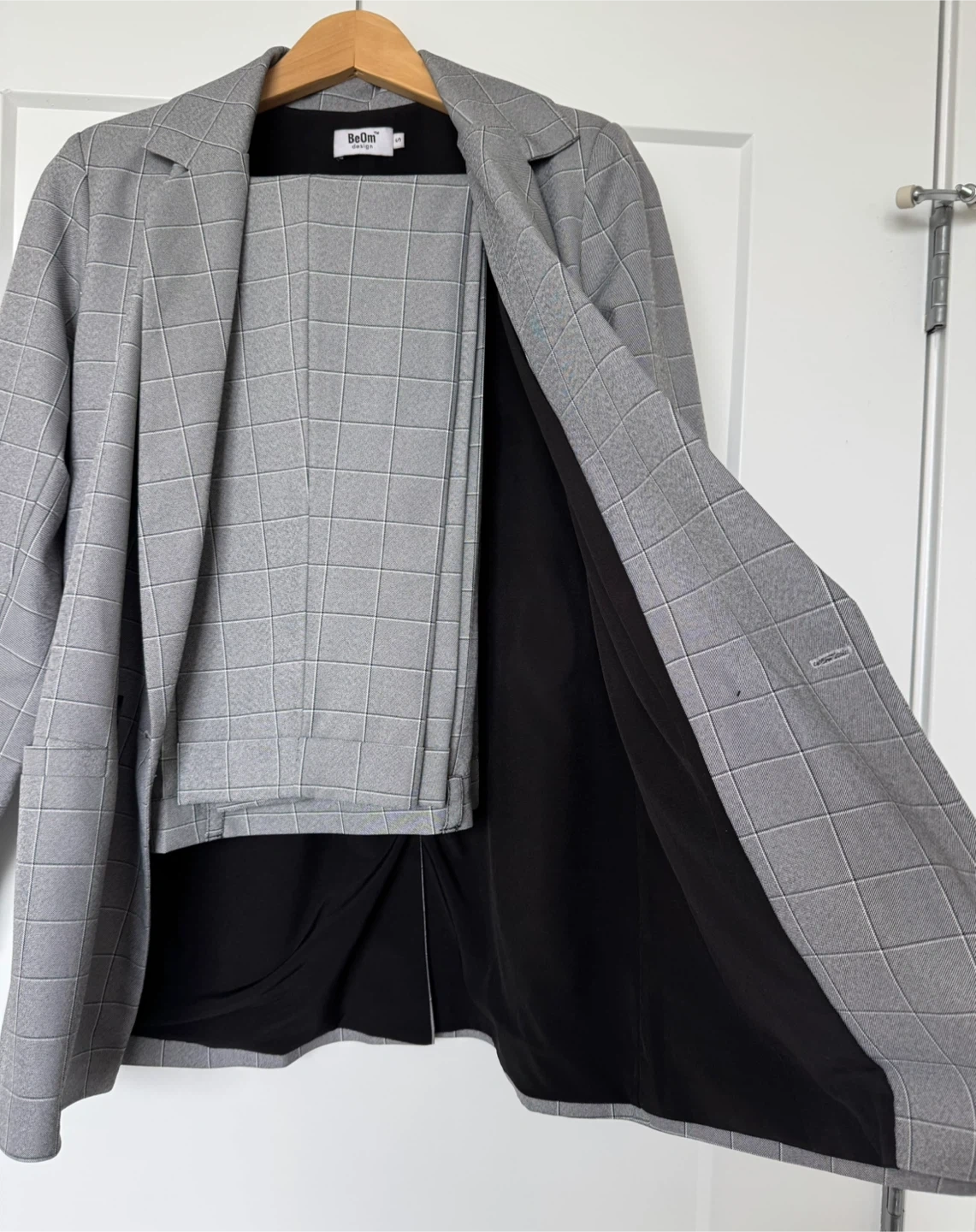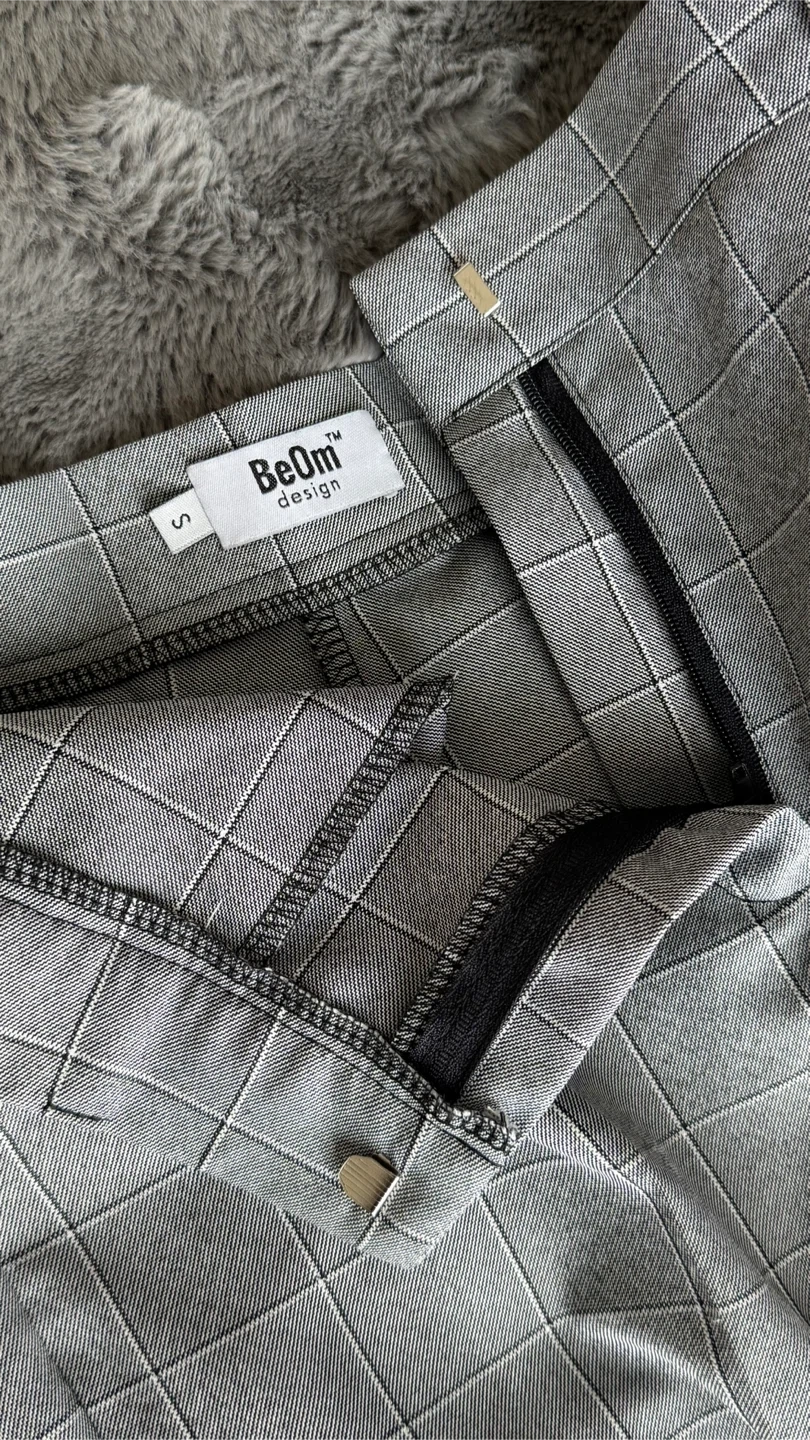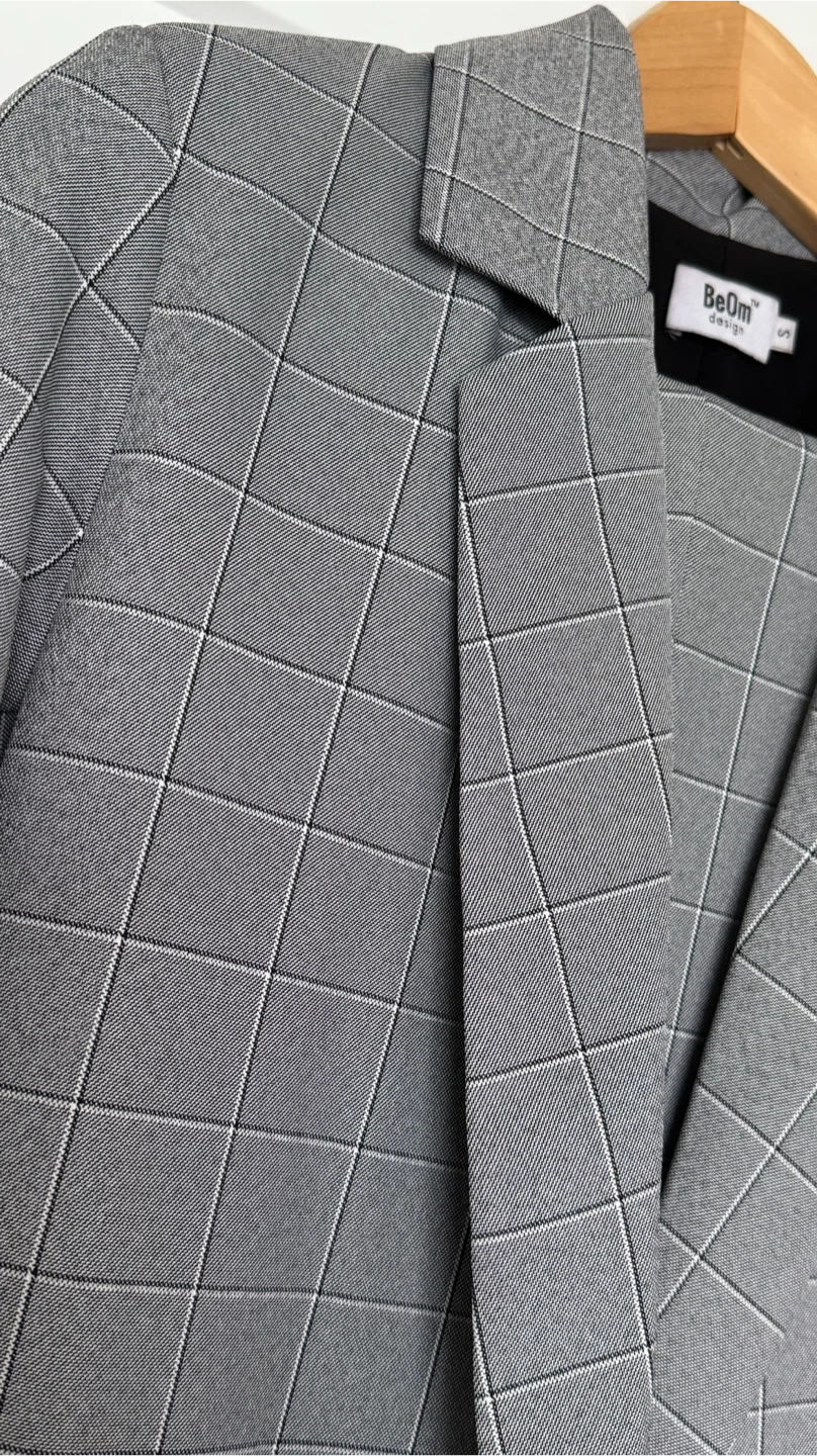 Elegant and versatile women’s suit from BeOm Design, featuring a classic gray windowpane pattern that works perfectly for office wear, business meetings, or smart casual styling.