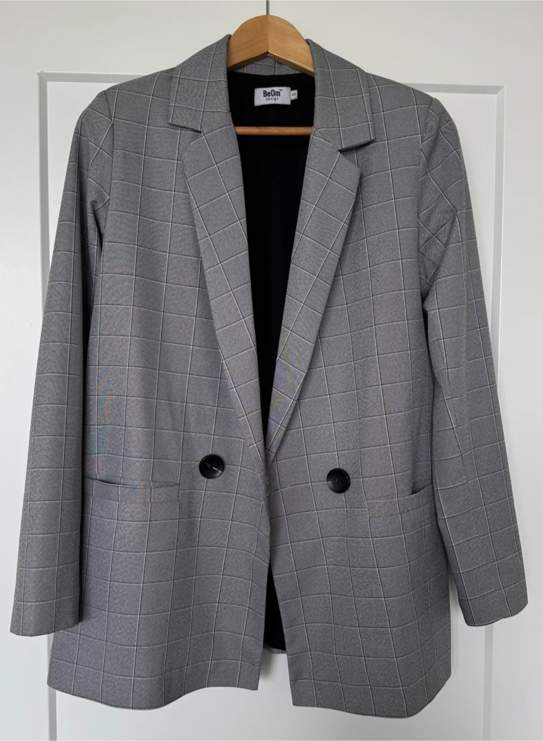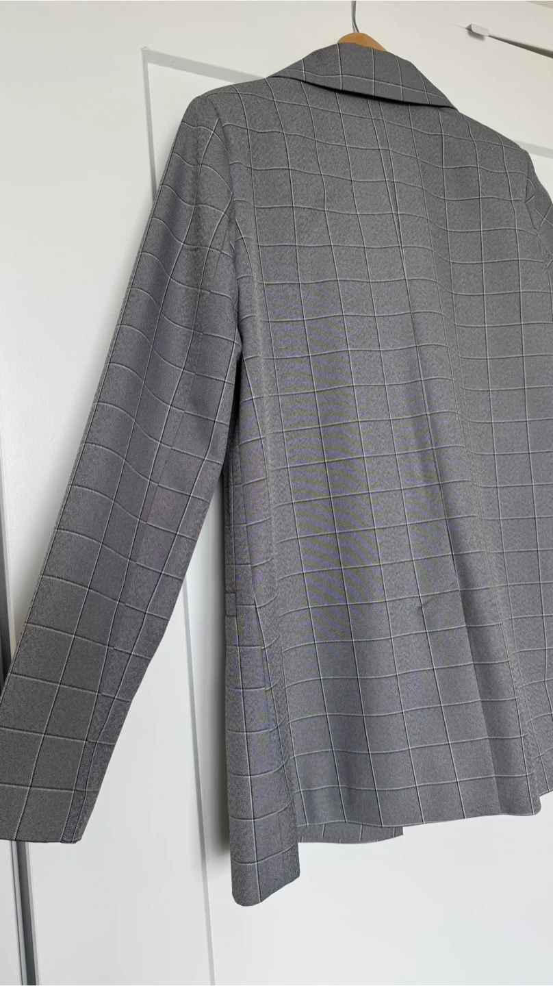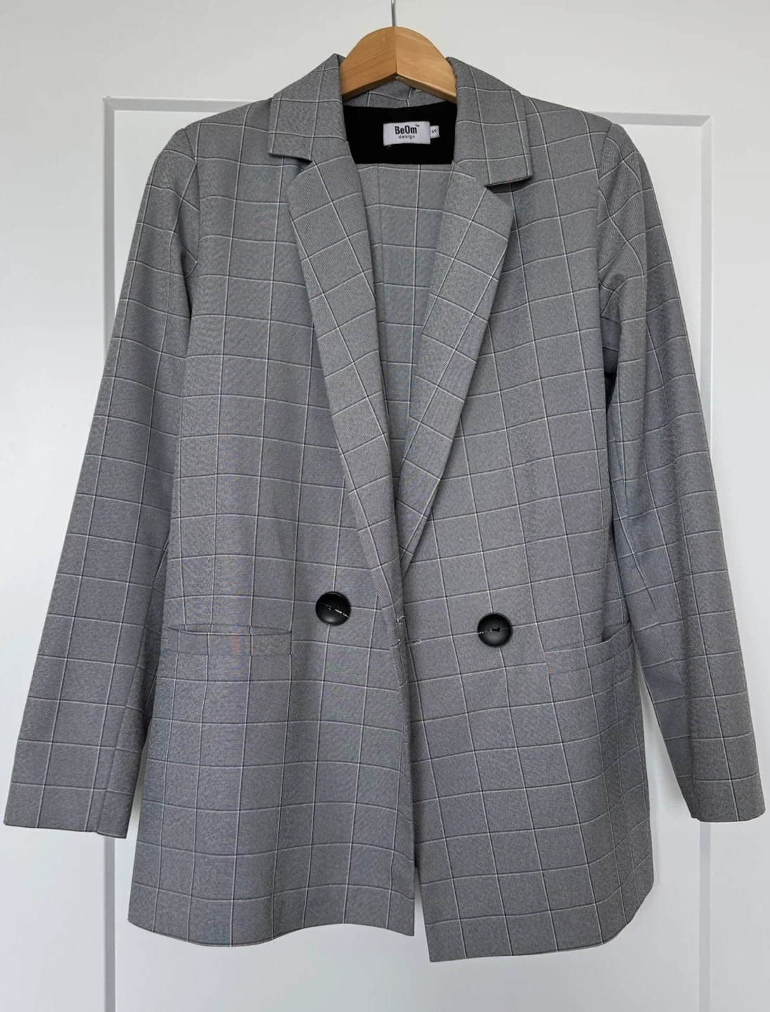 Elegant and versatile women’s suit from BeOm Design, featuring a classic gray windowpane pattern that works perfectly for office wear, business meetings, or smart casual styling.