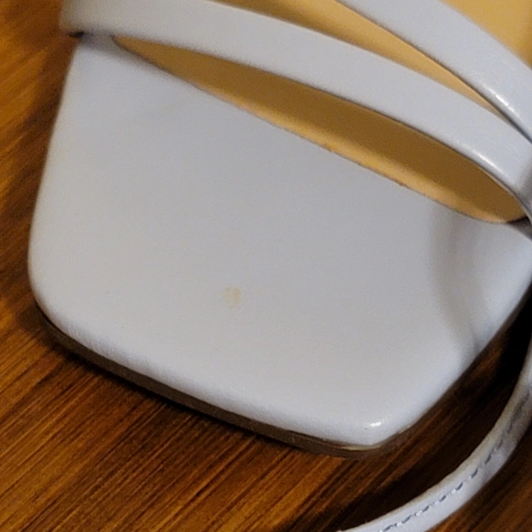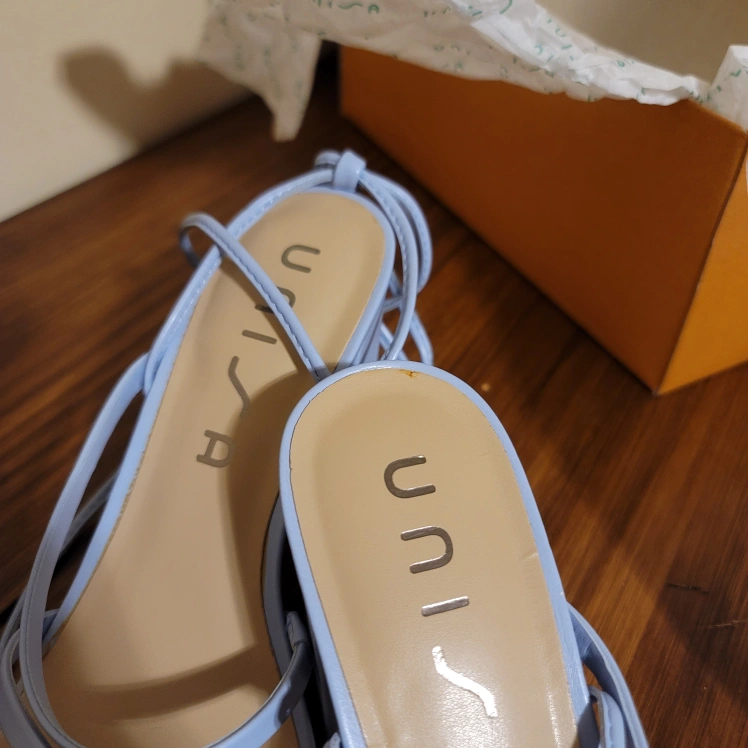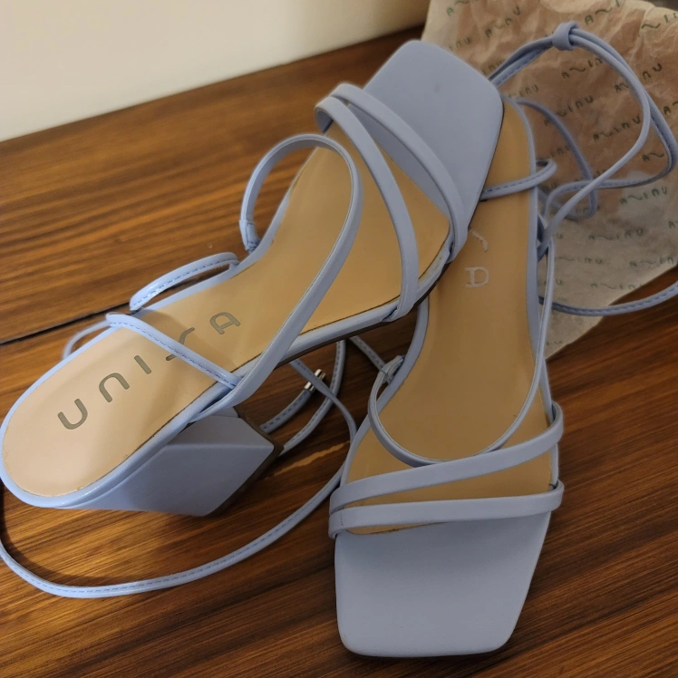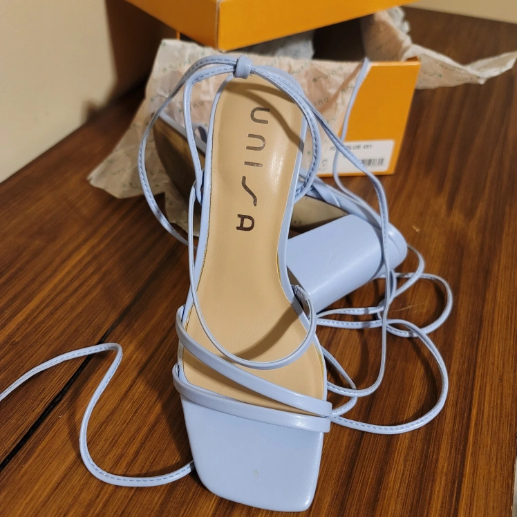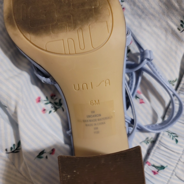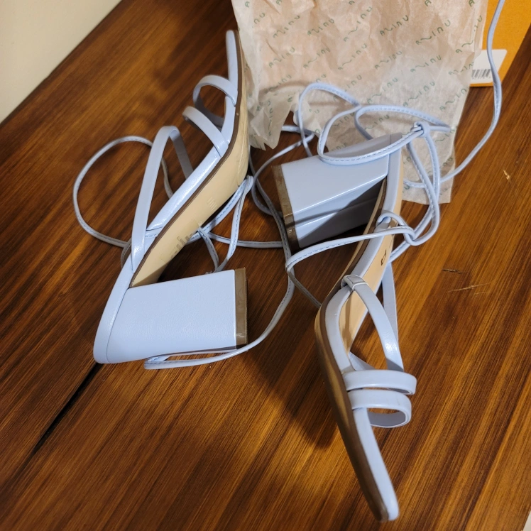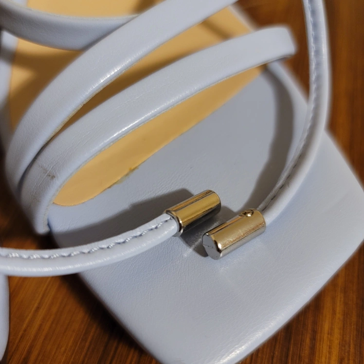 130The left sandal has a small stain on the toe area and the left one has a small black streak on one of the front straps (refer to the photos). Accept cash payment only. Details: - Light Blue - Synthetic upper - Ankle wrap lace-up closure - 25" laces - Square open toe - Synthetic lining - 3.25" covered block heel - Synthetic sole