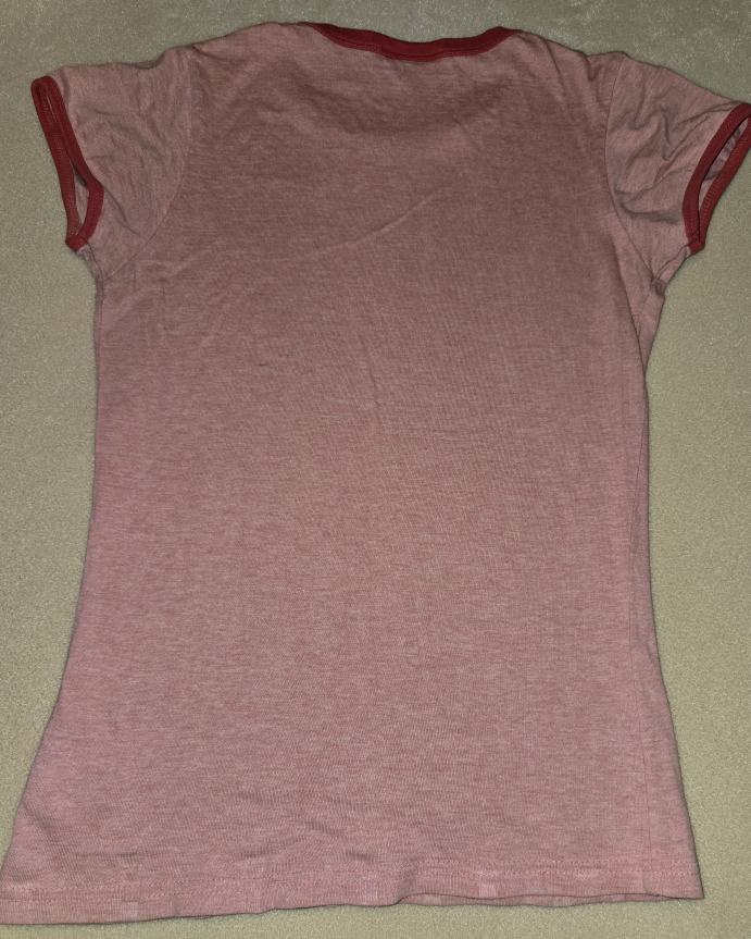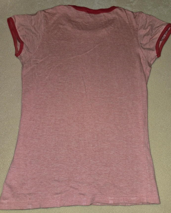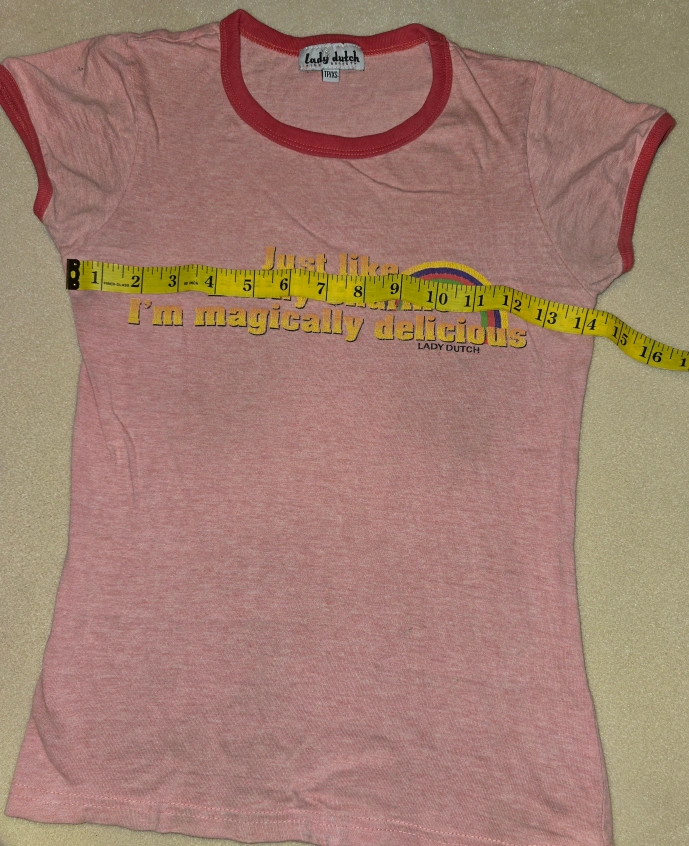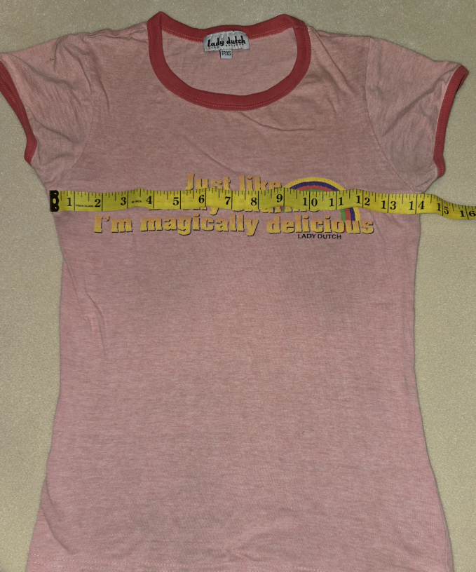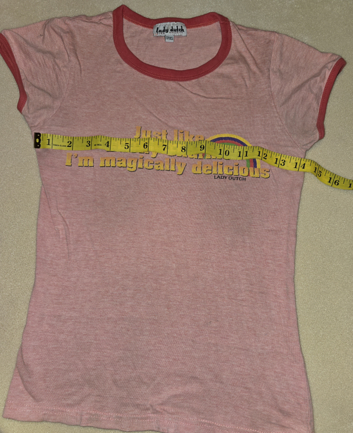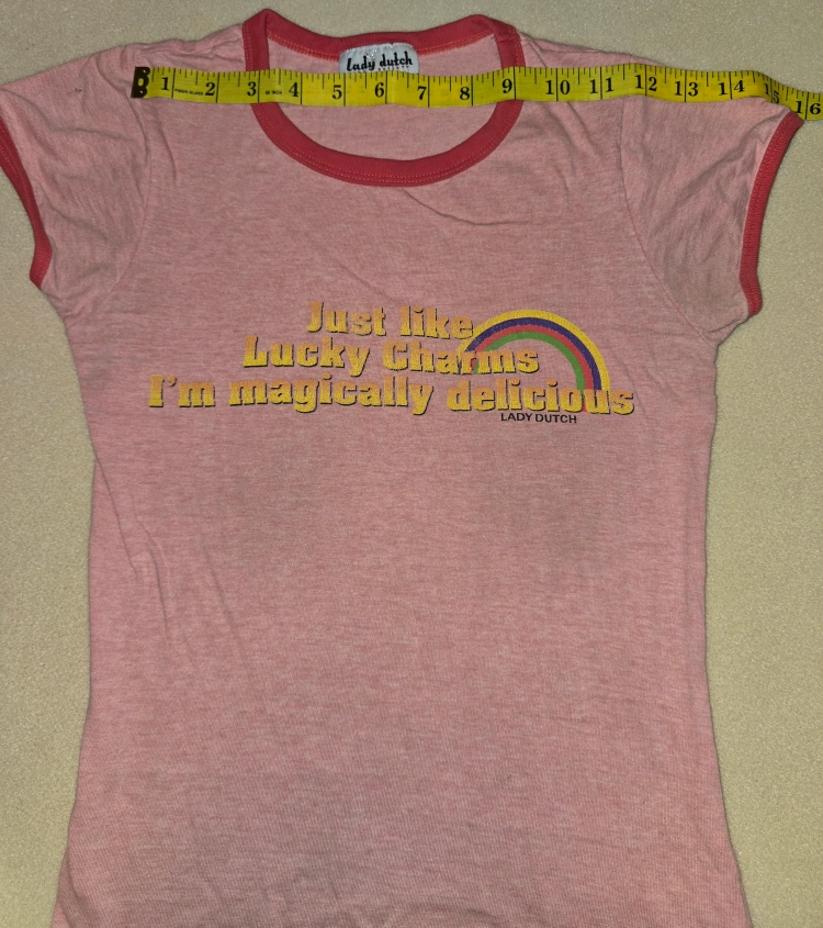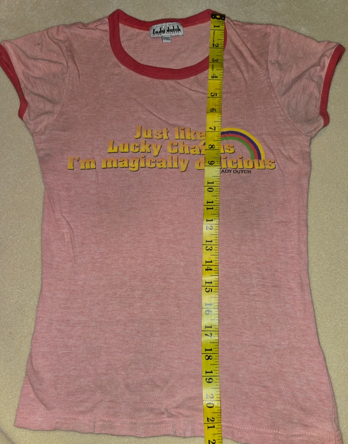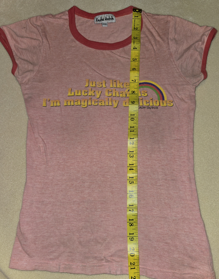 Super cute Lady Dutch T-shirt! It's pink with red trim and features the phrase "Just like Lucky Charms I'm magically delicious" with a rainbow graphic. Size is marked as T1/XS. Check out the measurements in the photos to see if it's the right fit for you
