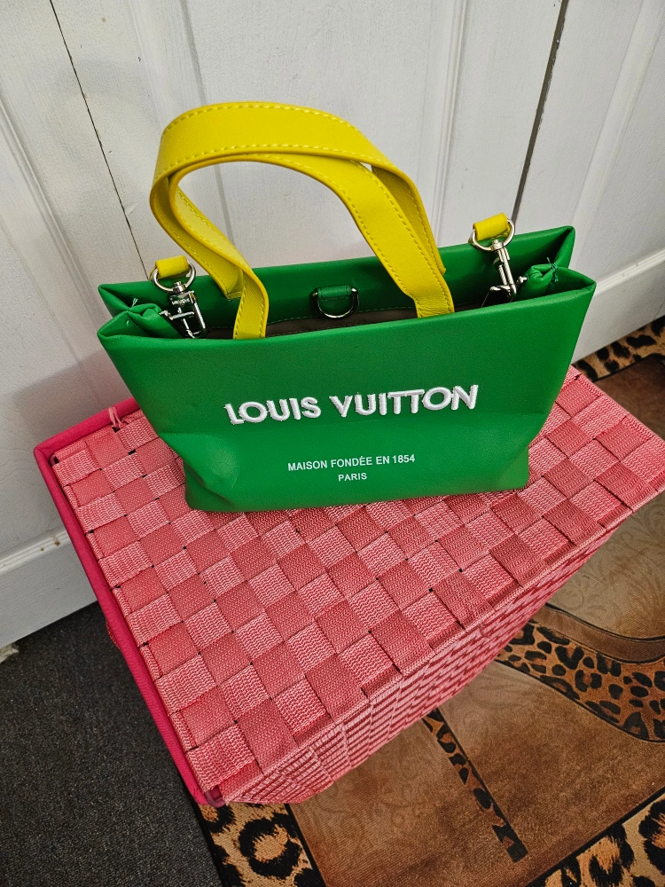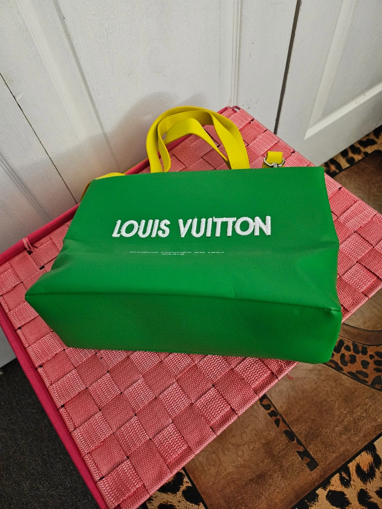 Selling a vibrant green Louis Vuitton tote bag with yellow straps! It's in great condition and ready for a new home. Perfect for adding a pop of color to your outfit