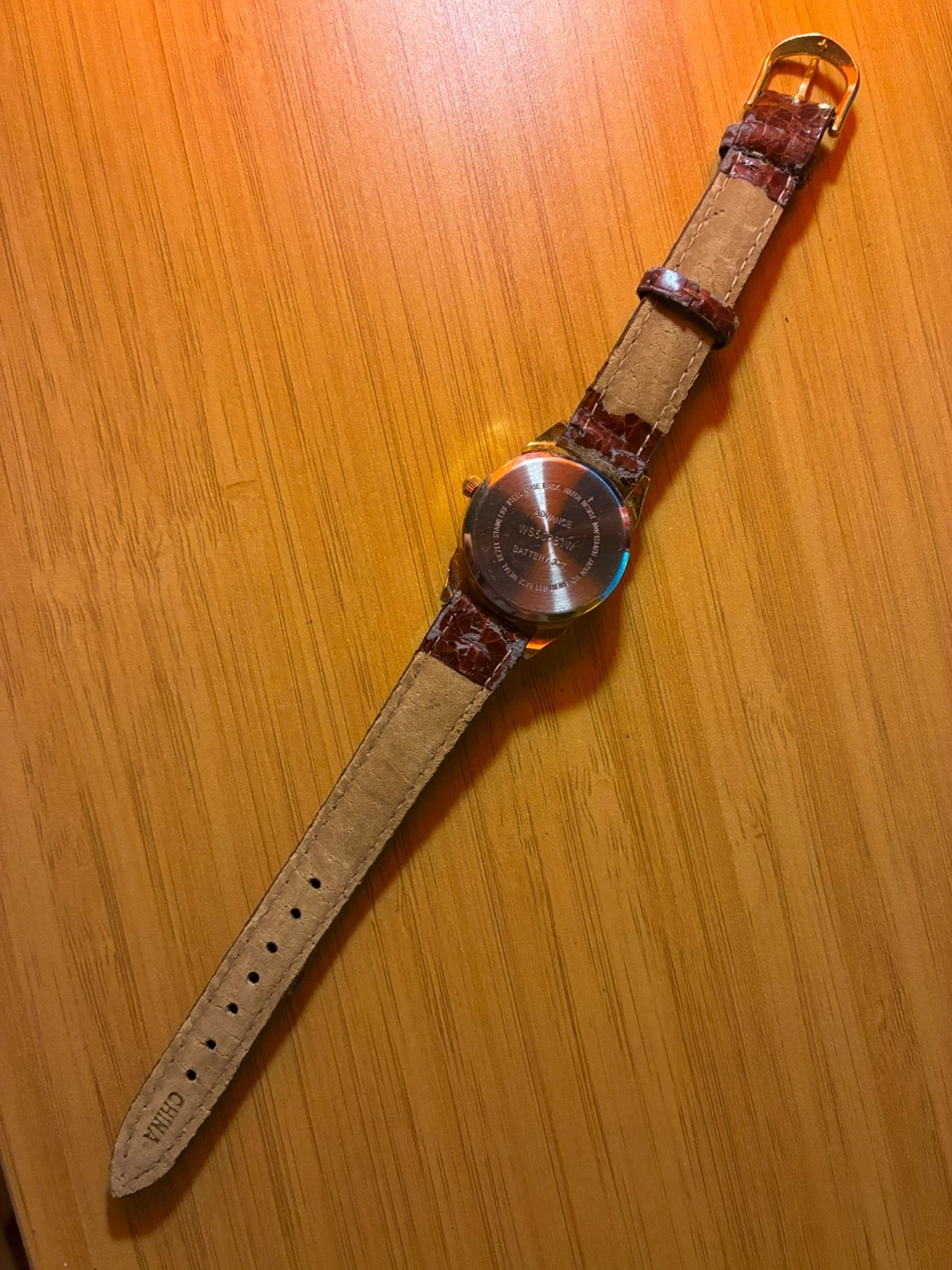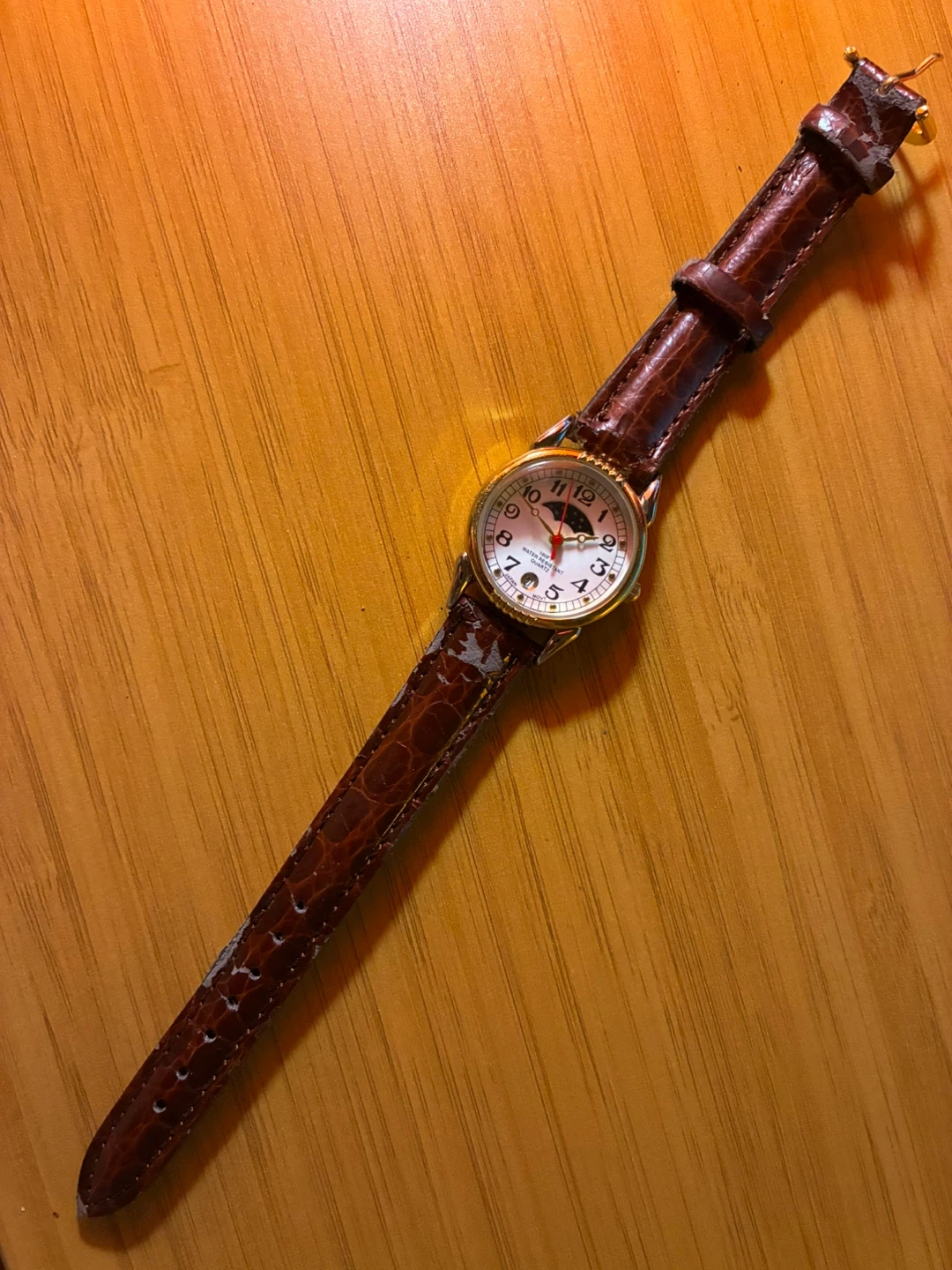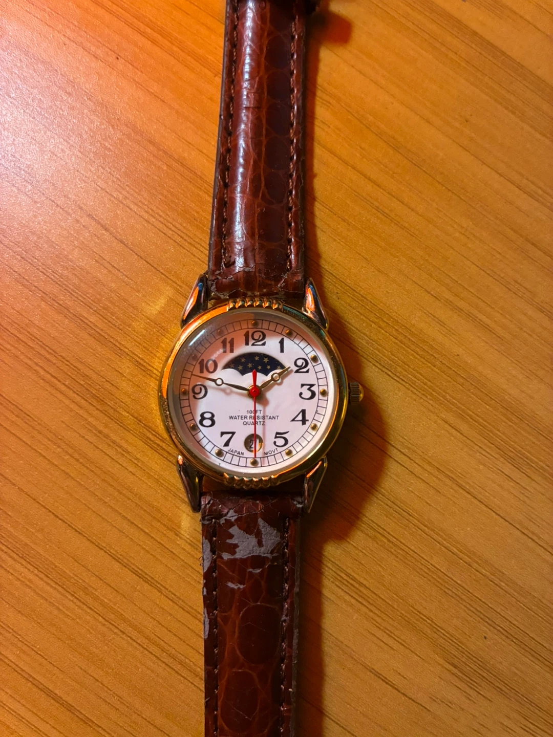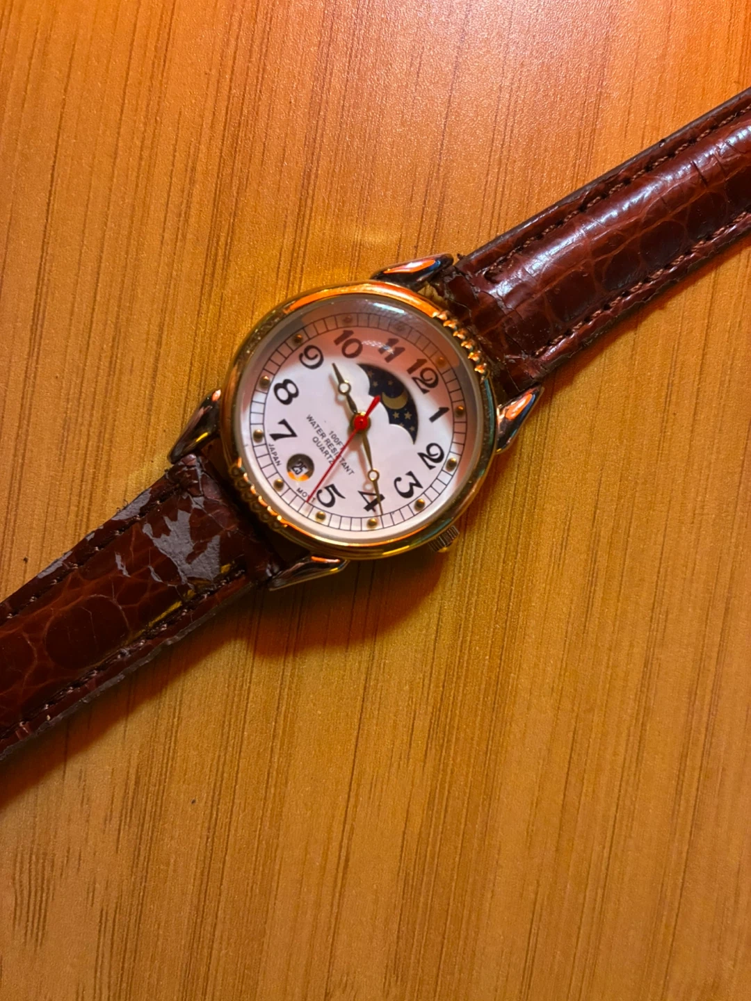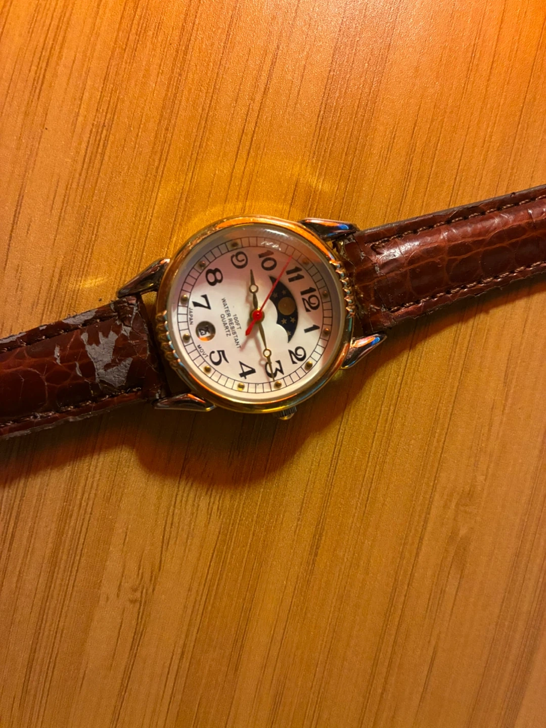 This water-resistant quartz watch features a classic white face with a moon phase complication. It's a stylish accessory for everyday wear. The band is made of brown faux leather. This watch is powered by a Japanese movement.