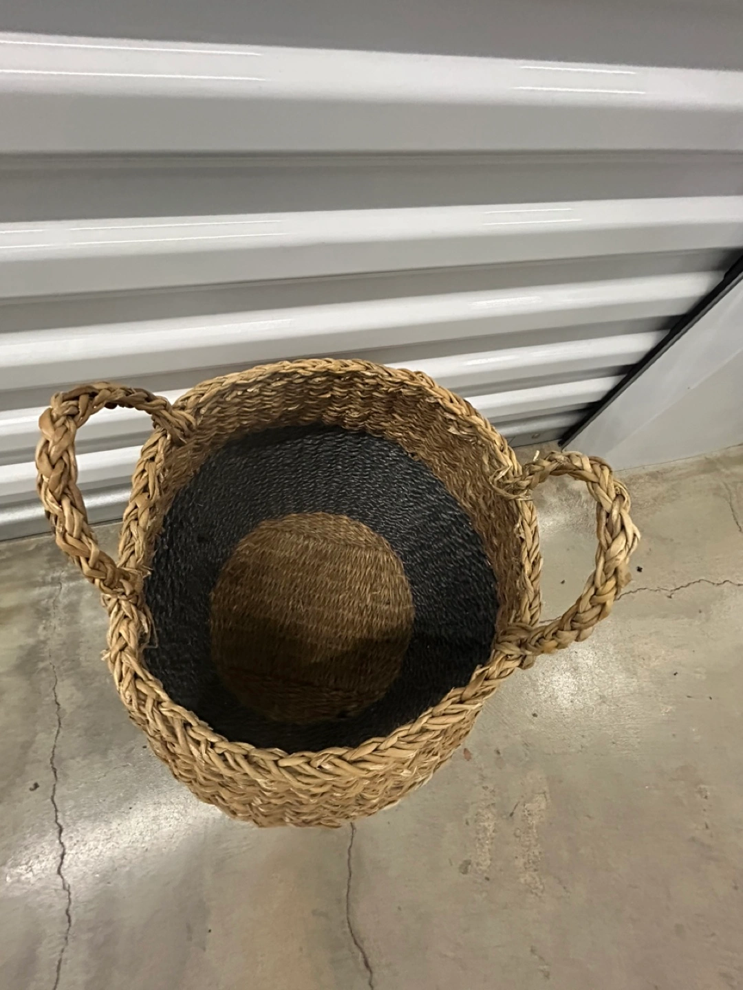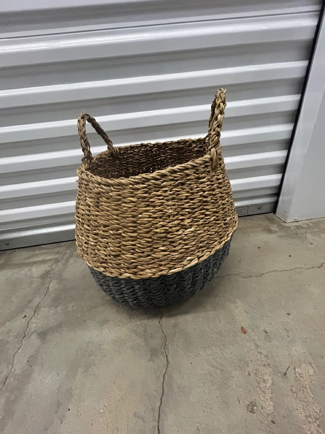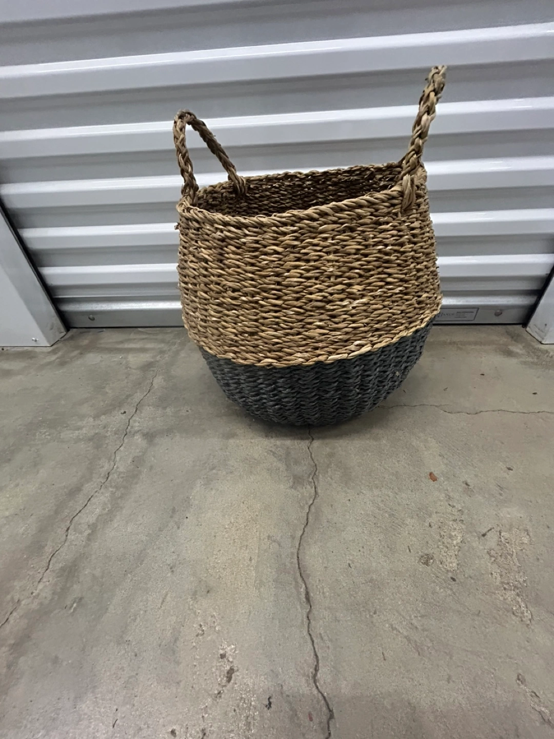 Selling a woven basket with handles! It's a cute two-tone design, with a natural woven top and a dark gray Perfect for storing blankets, toys, or laundry!