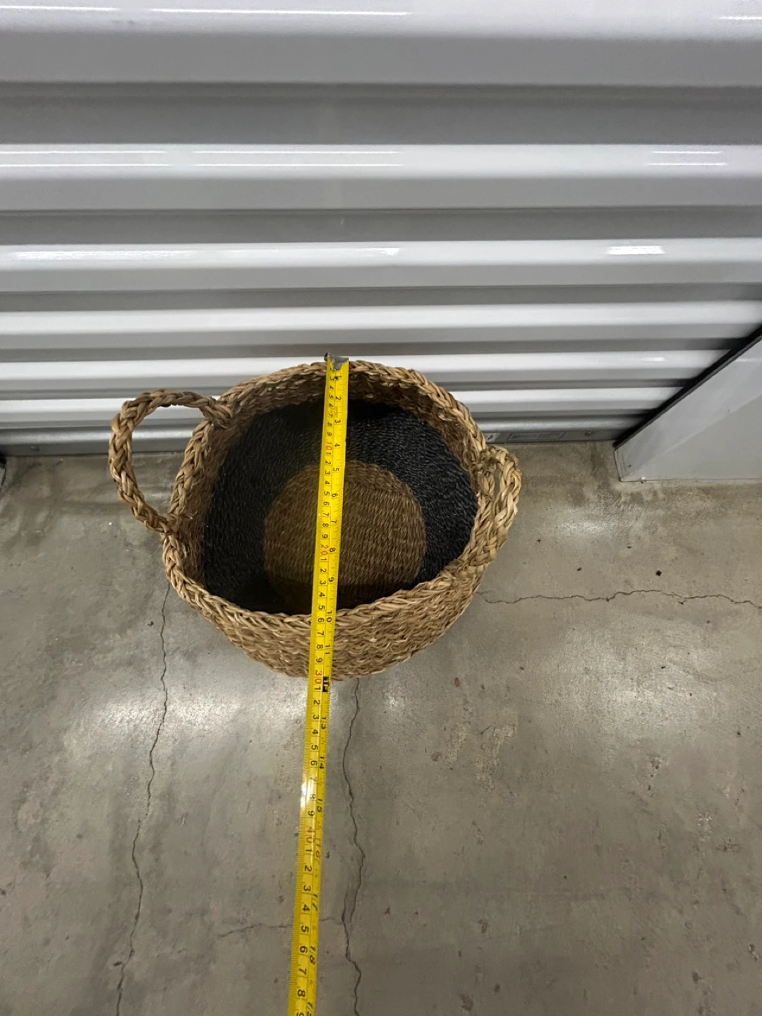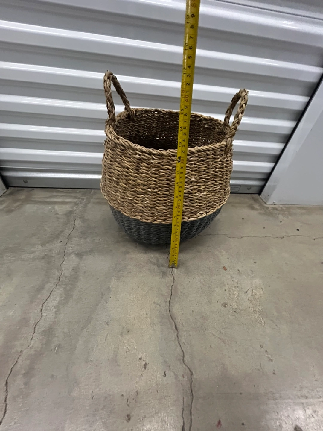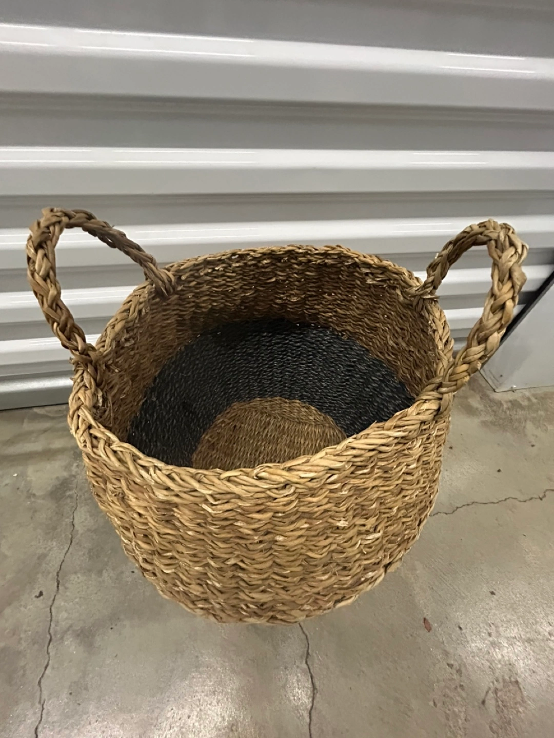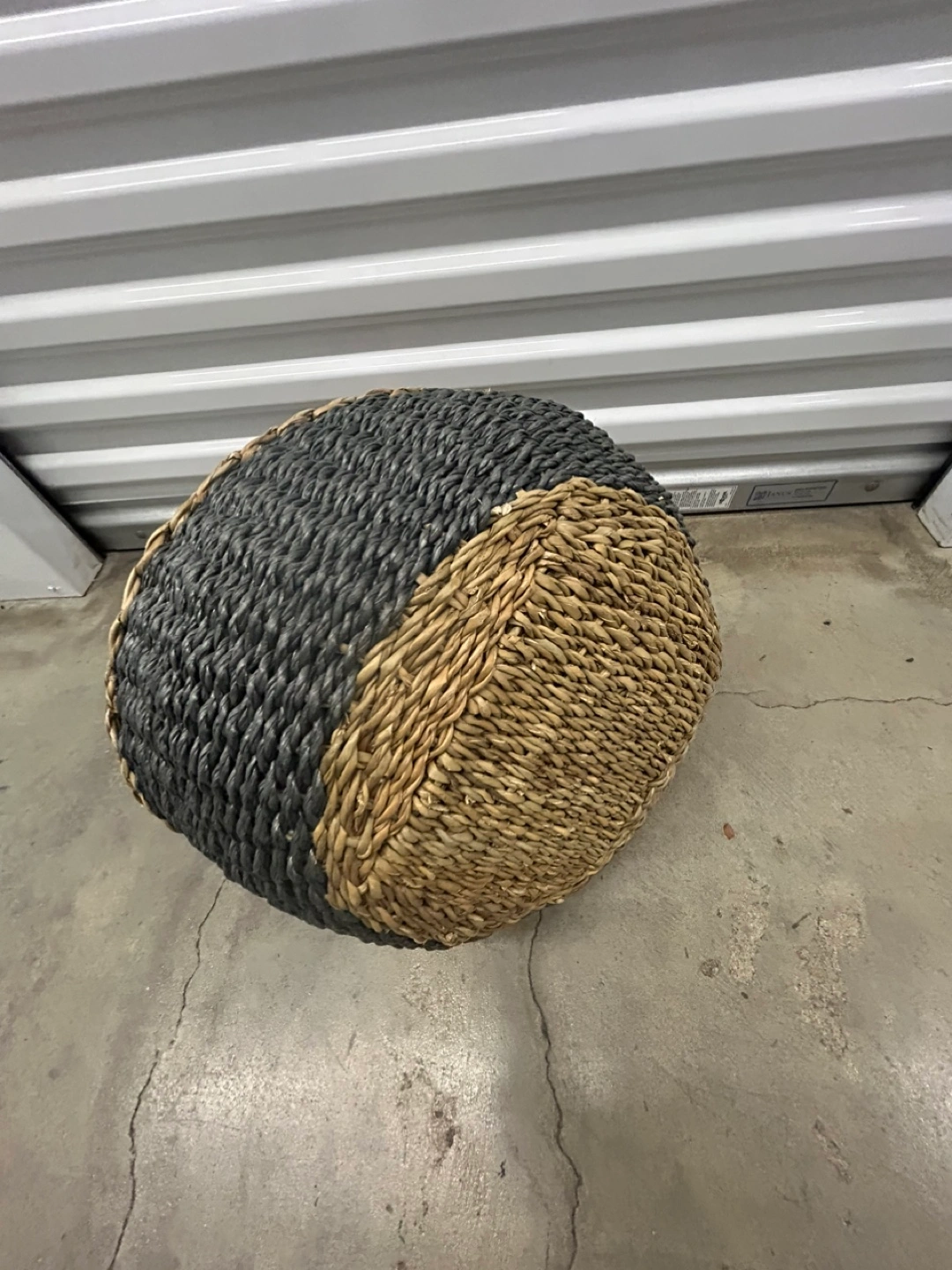 Selling a woven basket with handles! It's a cute two-tone design, with a natural woven top and a dark gray Perfect for storing blankets, toys, or laundry!
