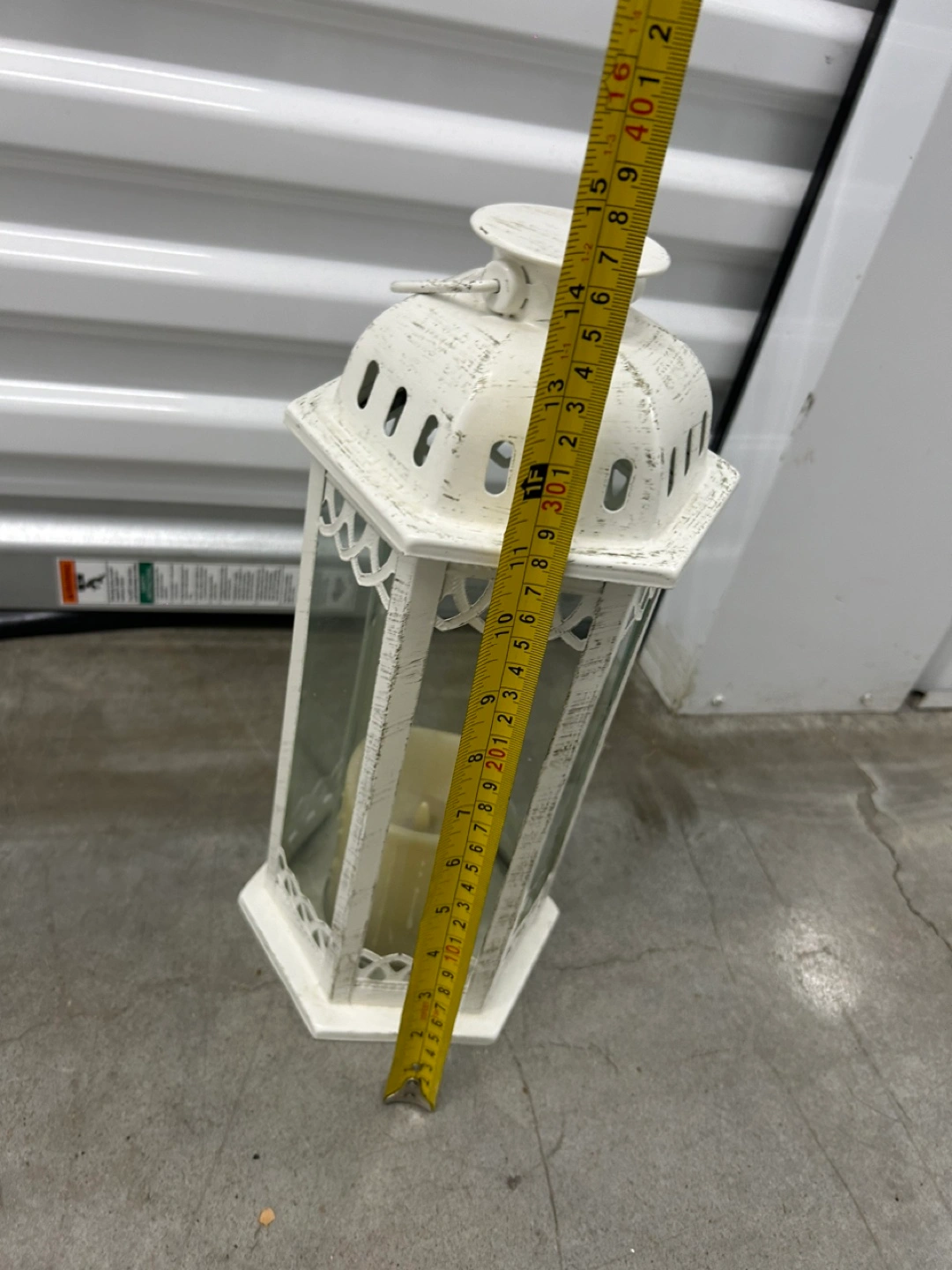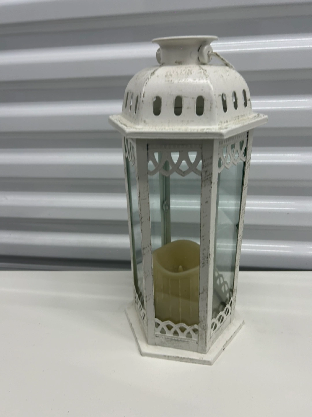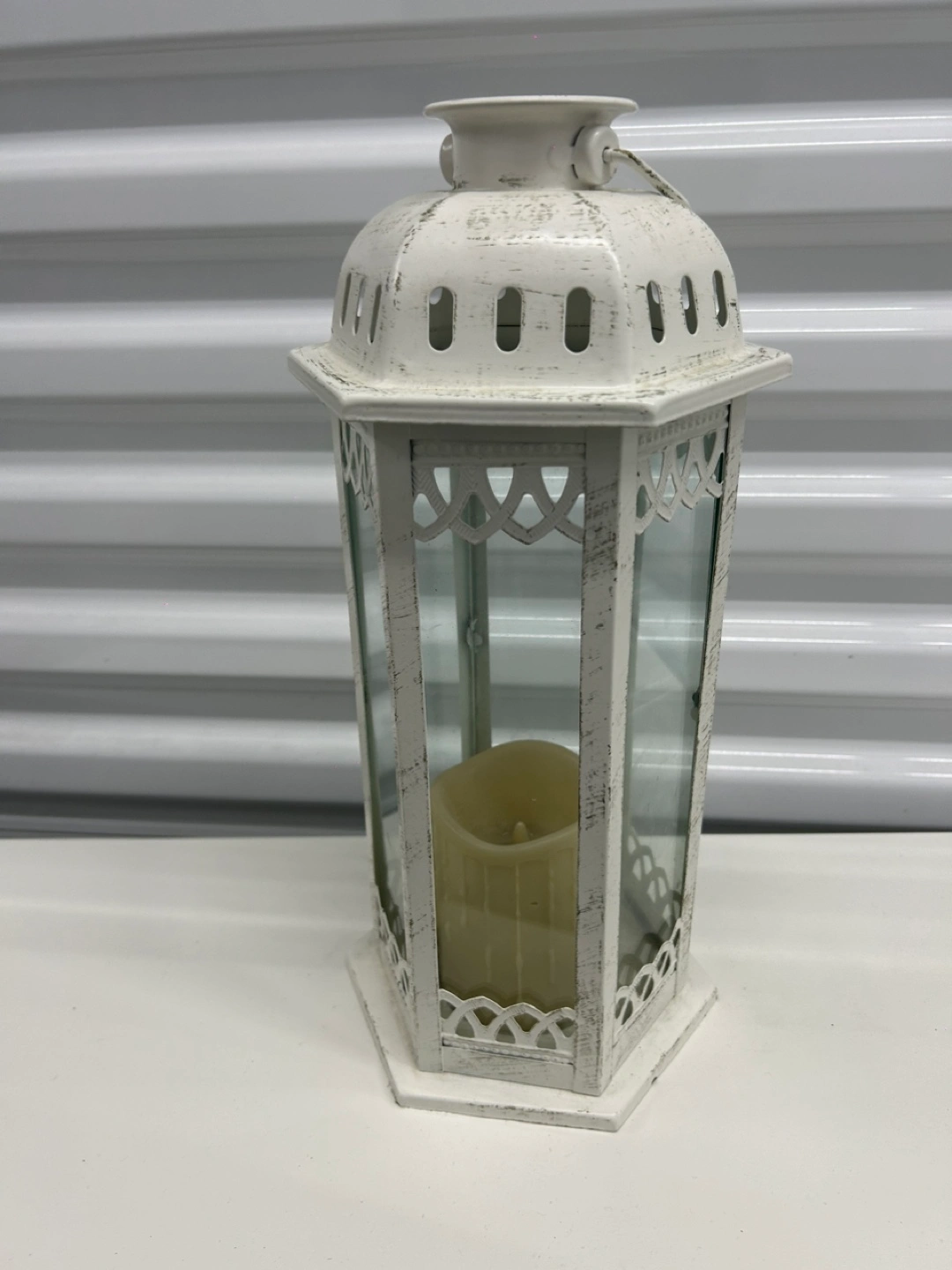 Selling a charming white lantern, perfect for adding a cozy touch to any room! It features a metal frame with glass panels and includes a candle inside. The lantern stands approximately 16 inches tall.