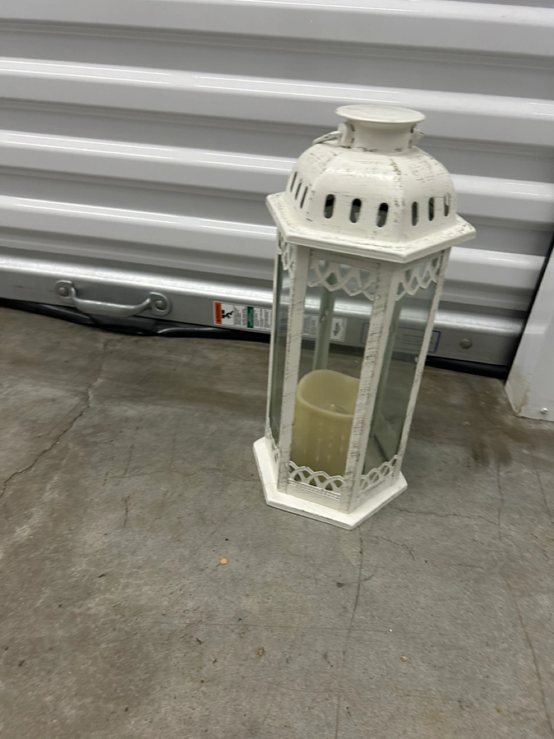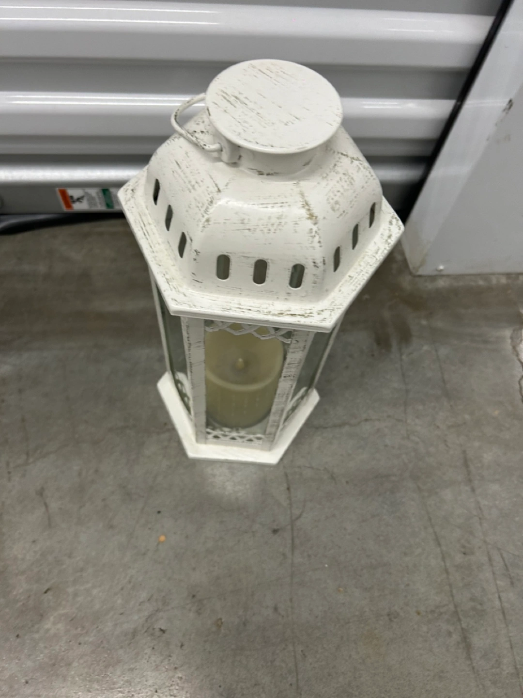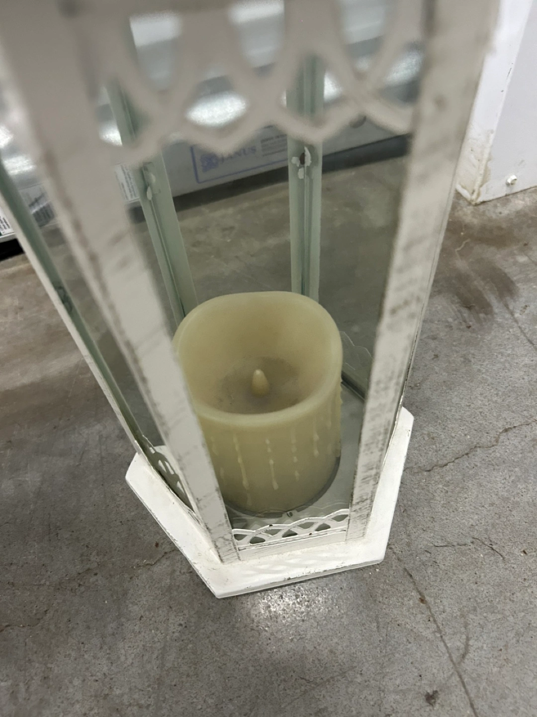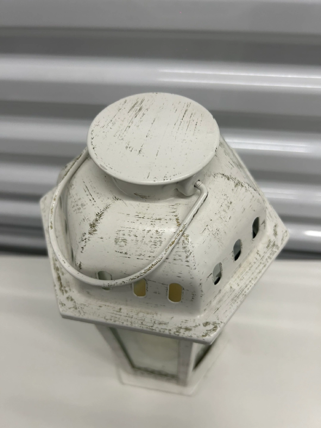Selling a charming white lantern, perfect for adding a cozy touch to any room! It features a metal frame with glass panels and includes a candle inside. The lantern stands approximately 16 inches tall.