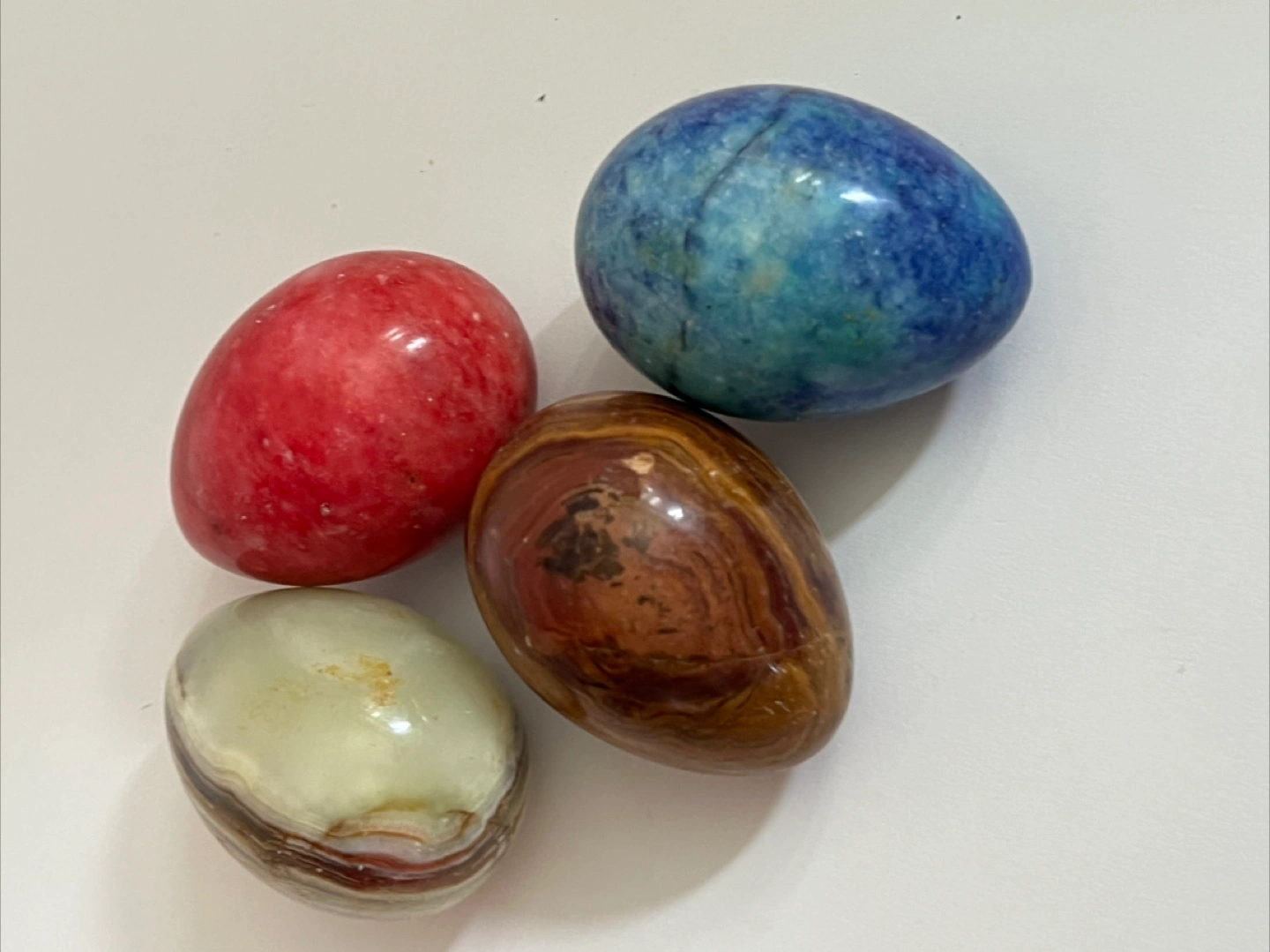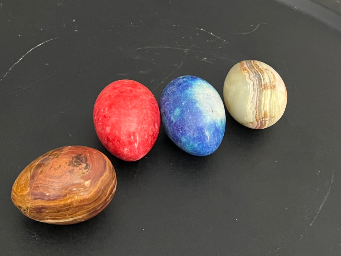 Selling a set of four decorative stone eggs. Semi precious. Stone. From turkey They come in red, brown, blue, and white. Great for adding a unique touch to your home decor!