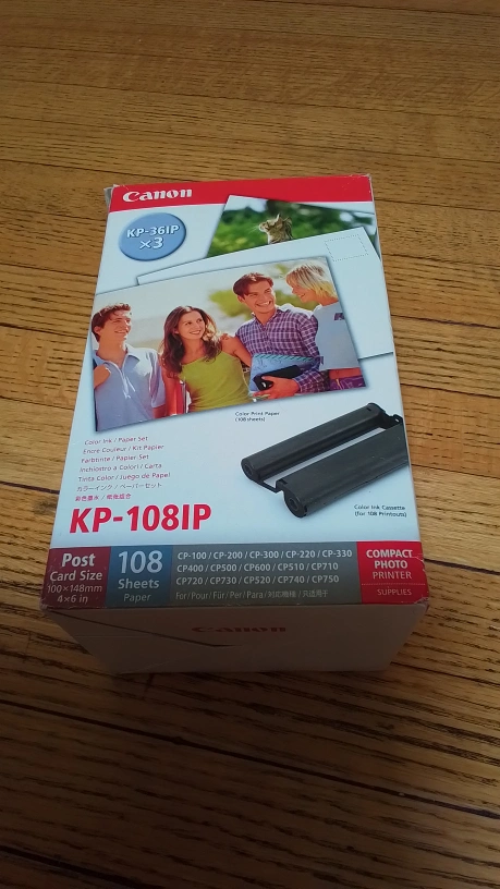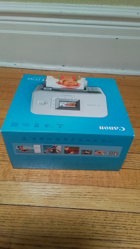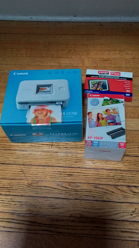 Selling a Canon Selphy CP740 compact photo printer. It comes with its original box and includes the power adapter, cables, and instruction manual. Also includes extra colour ink cassettes, unopened post cards and box of professional photo paper. Great for printing photos at home!