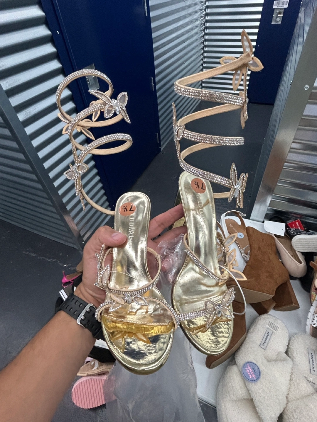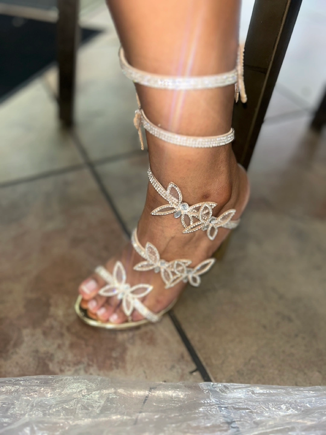 These are a pair of gold heels from LOUIVIA. They feature a butterfly and rhinestone design with a wrap-around ankle strap. They are perfect for a special occasion!