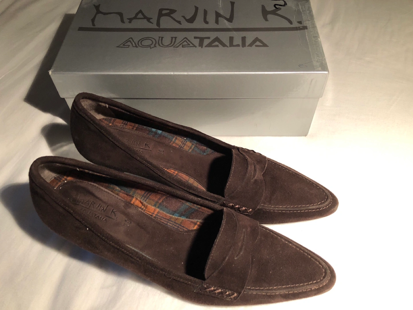 Gently used. Penny loafer style brown suede pump. Waterproof, stain resistant uppers. Fabric lined, rubber soled, stacked kitten heels.