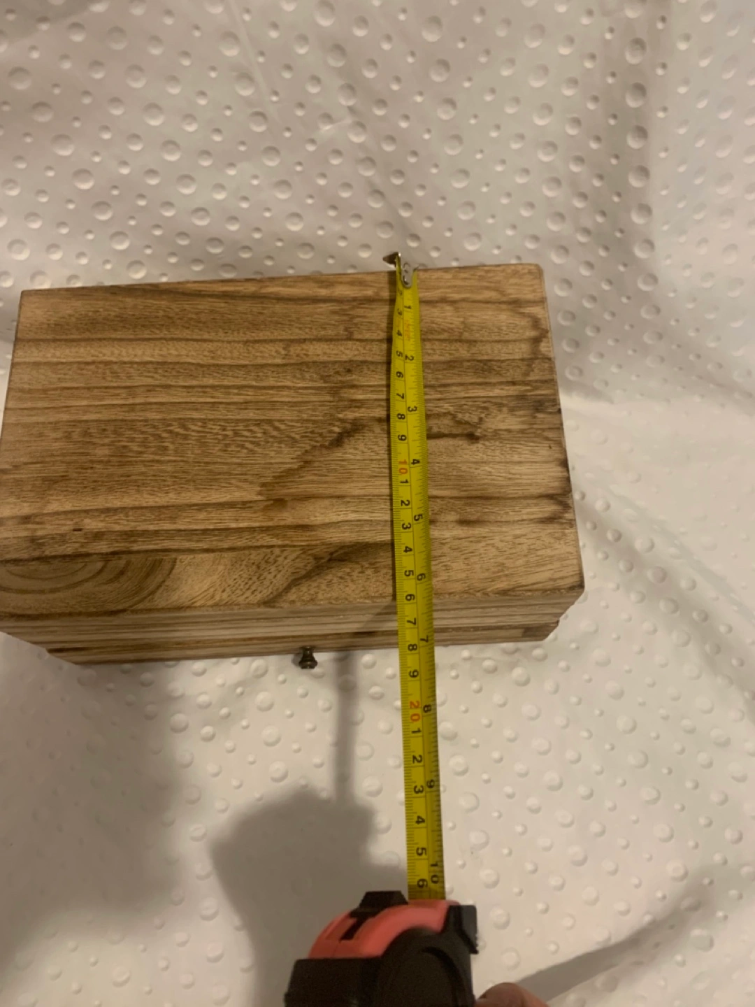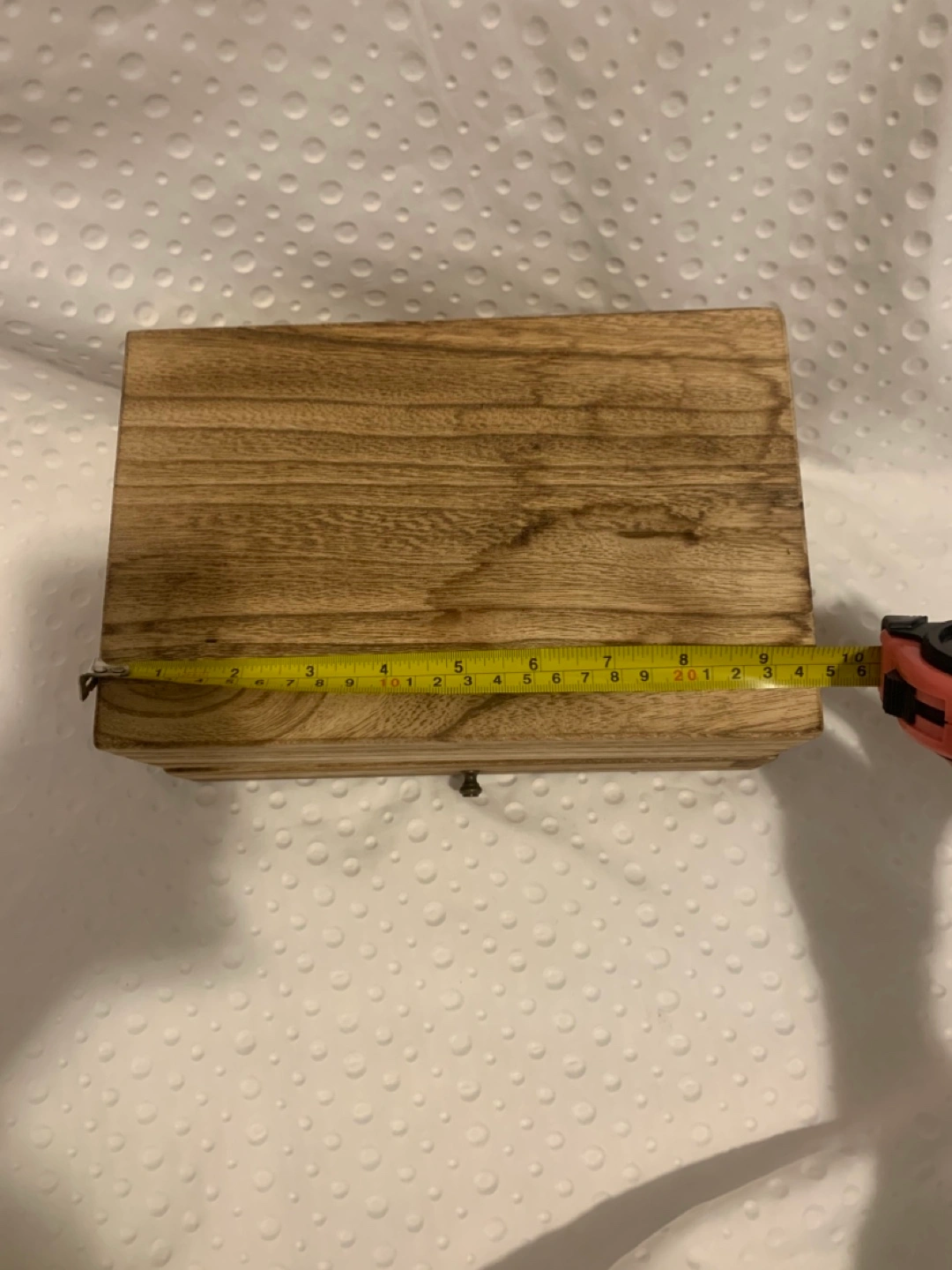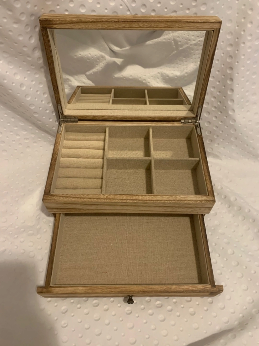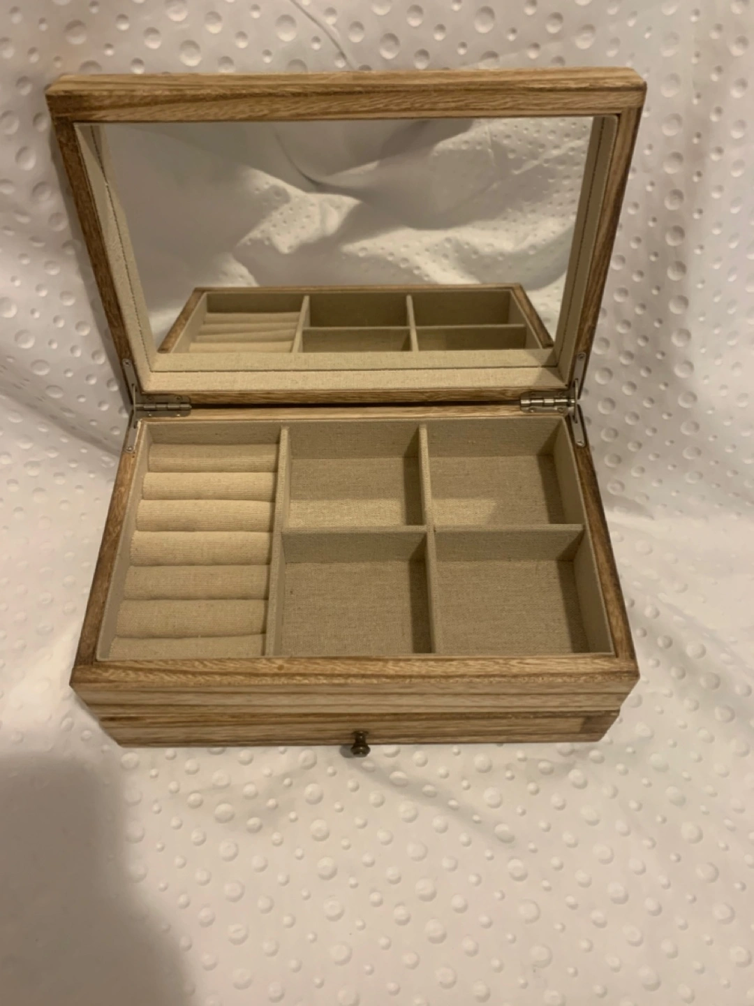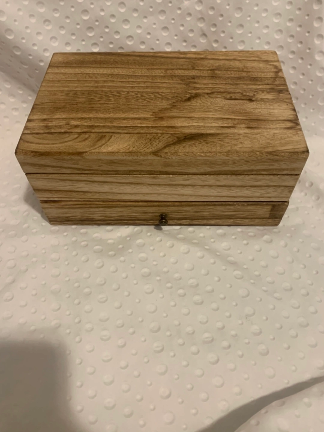 68Selling a wooden jewelry box with a mirror and a small drawer! It's perfect for organizing your jewelry and keeping it safe. The box measures approximately 6 inches in length, 4.5 inches in width, and 4.5 inches in height. (Slight stain damage to top)