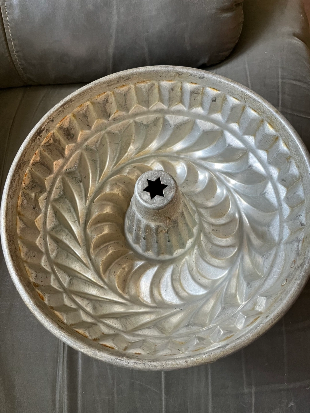 Selling a vintage copper Bundt pan! It has a lovely spiral design and would be perfect for baking a beautiful cake. There are a lot of scratches and dark spots inside.It's ready for a new home.