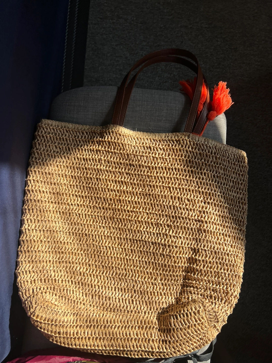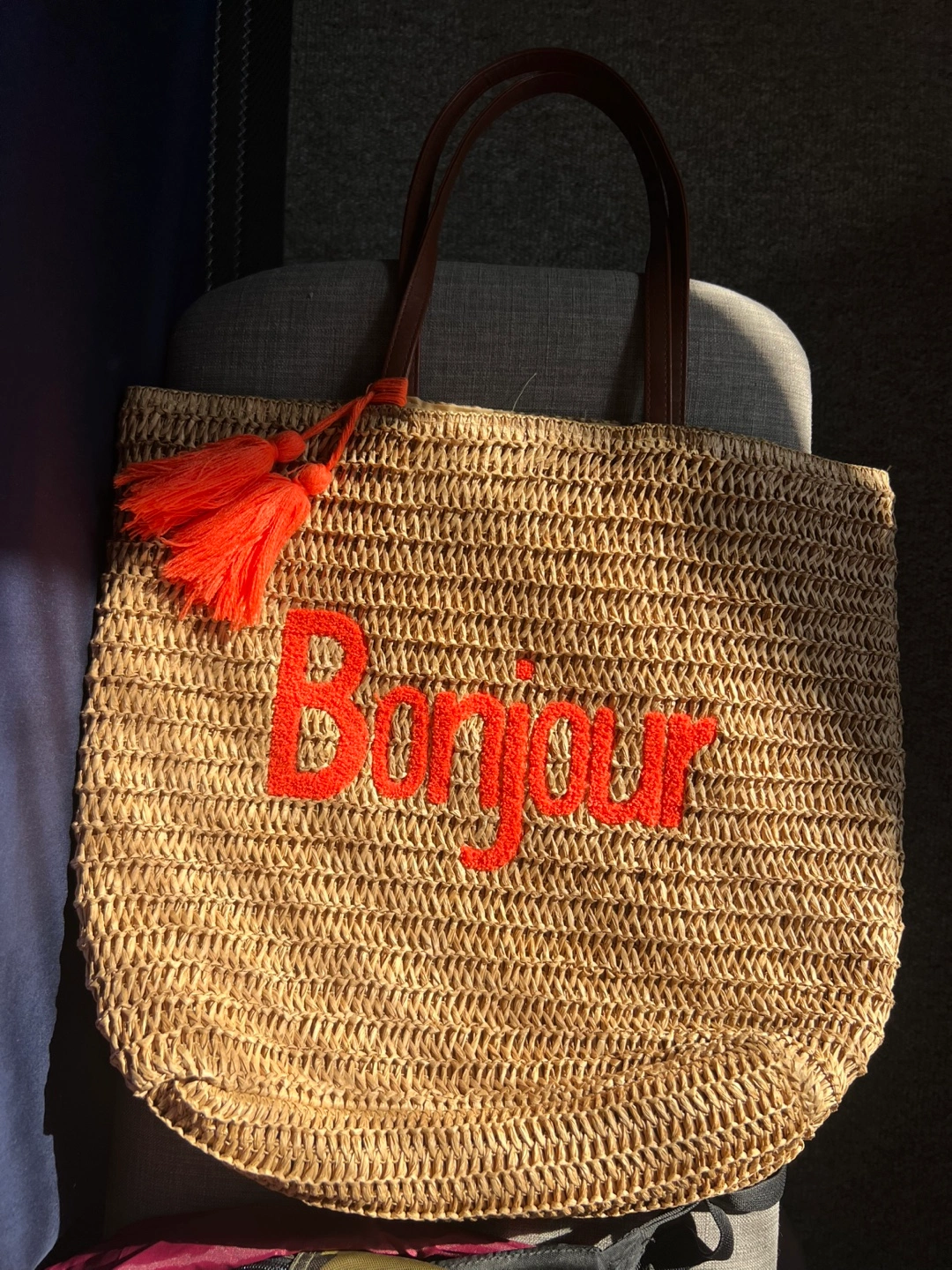 This is a lovely straw tote bag featuring the word 'Bonjour' in a vibrant orange color. The bag has brown handles and an orange tassel for a pop of color. It's perfect for carrying your essentials to beach or pool in style!