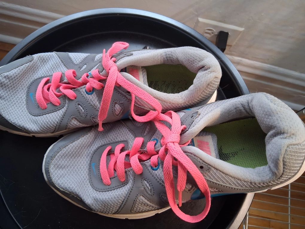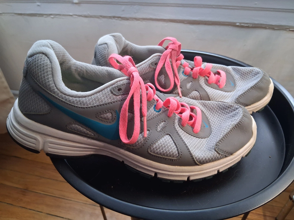 60Selling a pair of Nike Revolution 2 sneakers. They are gray with blue accents and pink laces. In good condition with some signs of wear on the soles, as shown in the photos. Perfect for running or everyday wear!