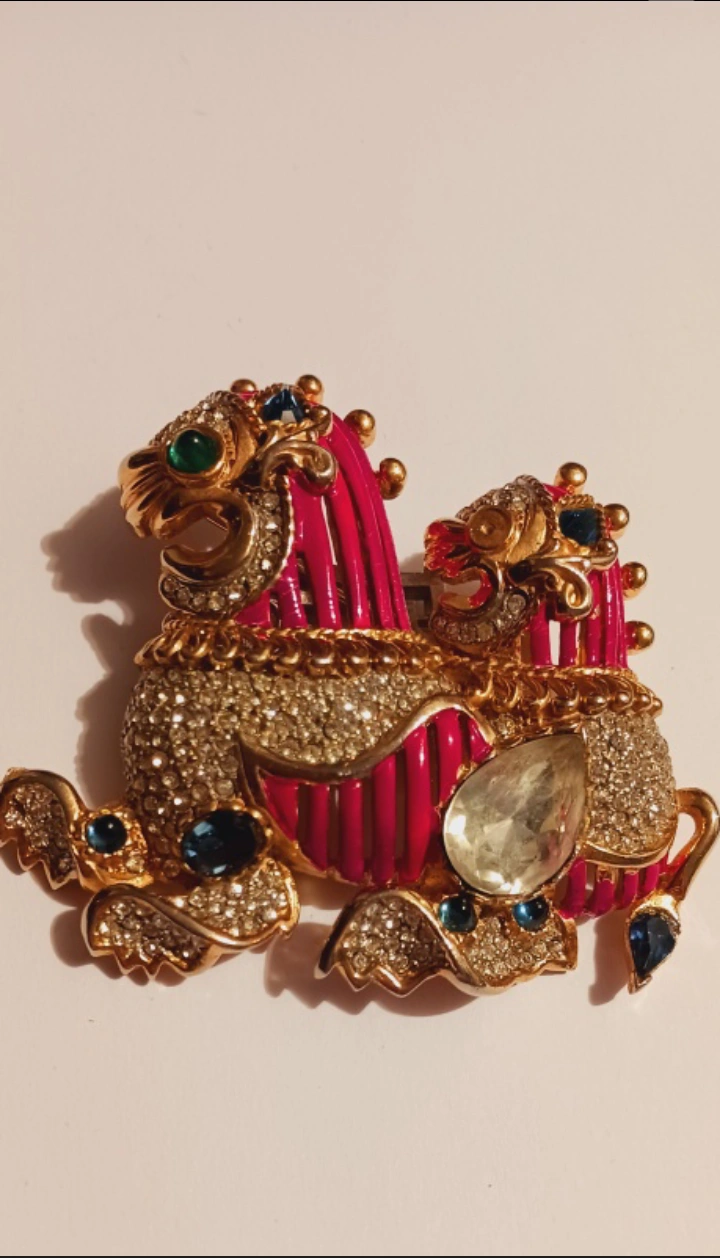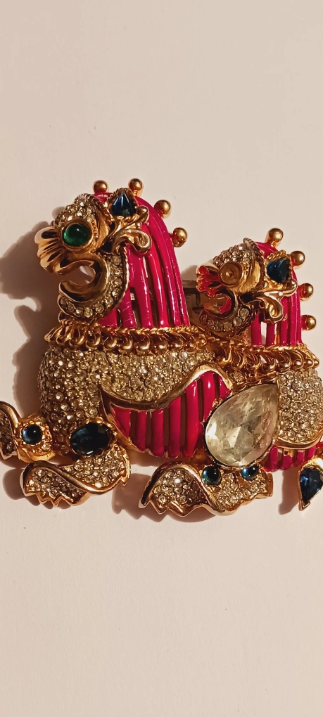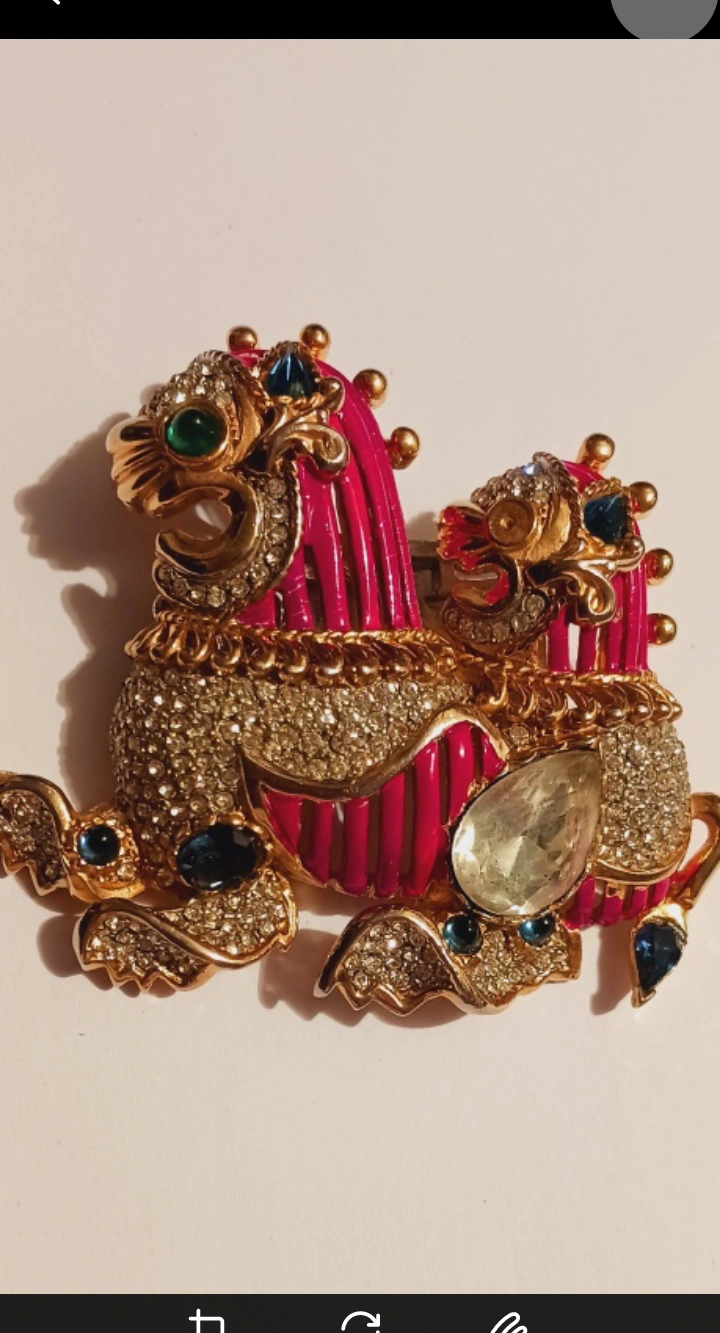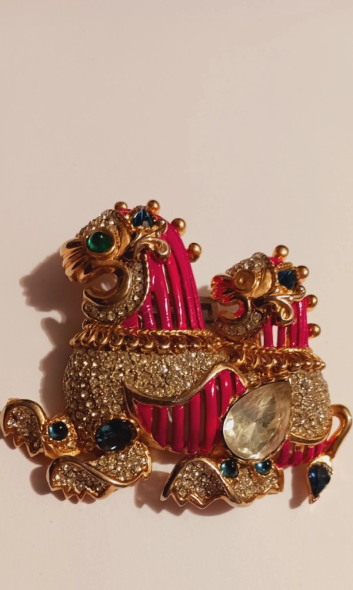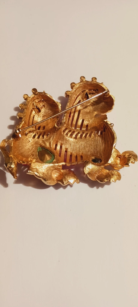 Absolutely Gorgeous Large Vintage rhinestone Asian foo dog brooch. It's a unique and eye-catching piece with gold tone metal, rhinestones, and enamel detailing. Perfect for adding a touch of vintage charm to any outfit! 3"×3". Excellent condition. ALL MY PRICES ARE NEGOTIABLE !!!