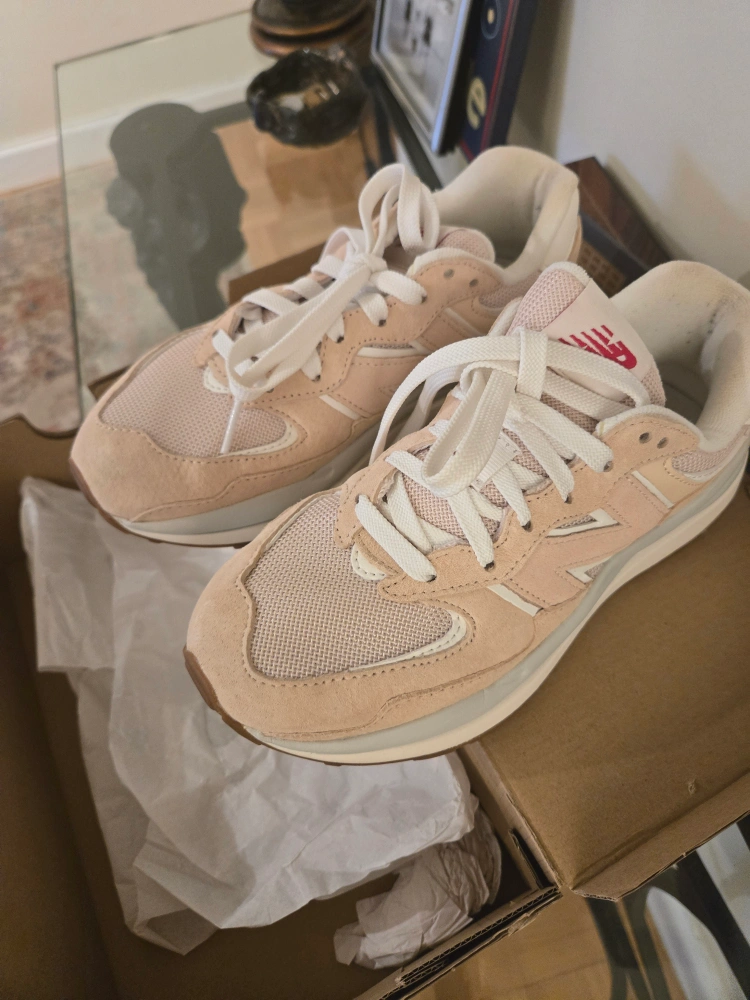 92Selling a pair of New Balance 57/40 lifestyle shoes for women. They are a lovely light pink color and come with the original box. The size is a US 7.