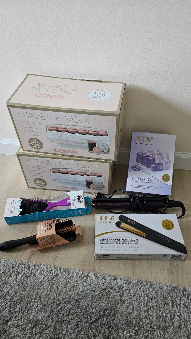 selling all together. Hot tools travel iron never opened. one box of curlers opened one brand new. hot tools purple curlers brand new. my daughter just cracked the box. Revlon iron lightly used. one Conair curlers box retales about $60 ... lot of value in this bundle.