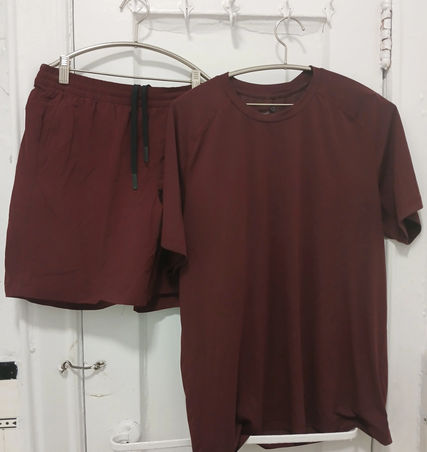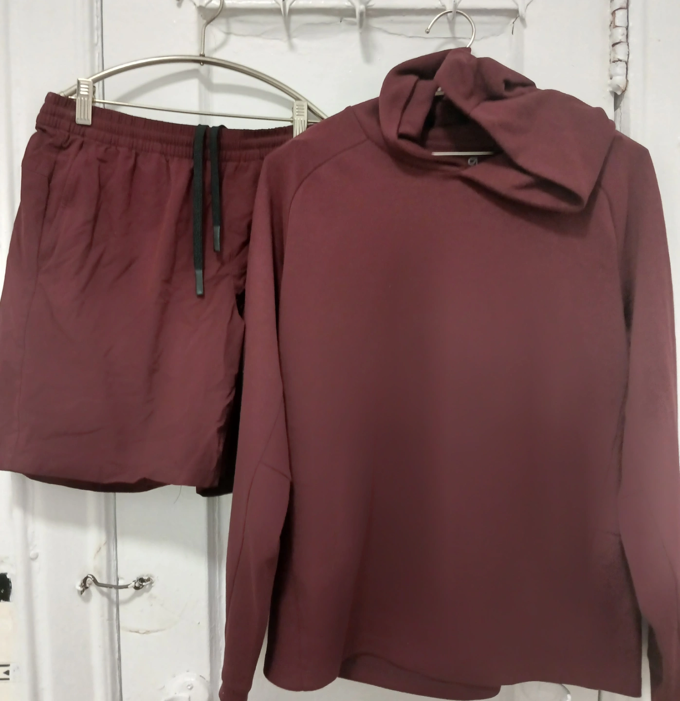 Men's maroon athletic set. Includes a hoodie, a short-sleeved t-shirt, and shorts. Soft material, comfortable fit. Size Medium. Great for workouts or casual wear.