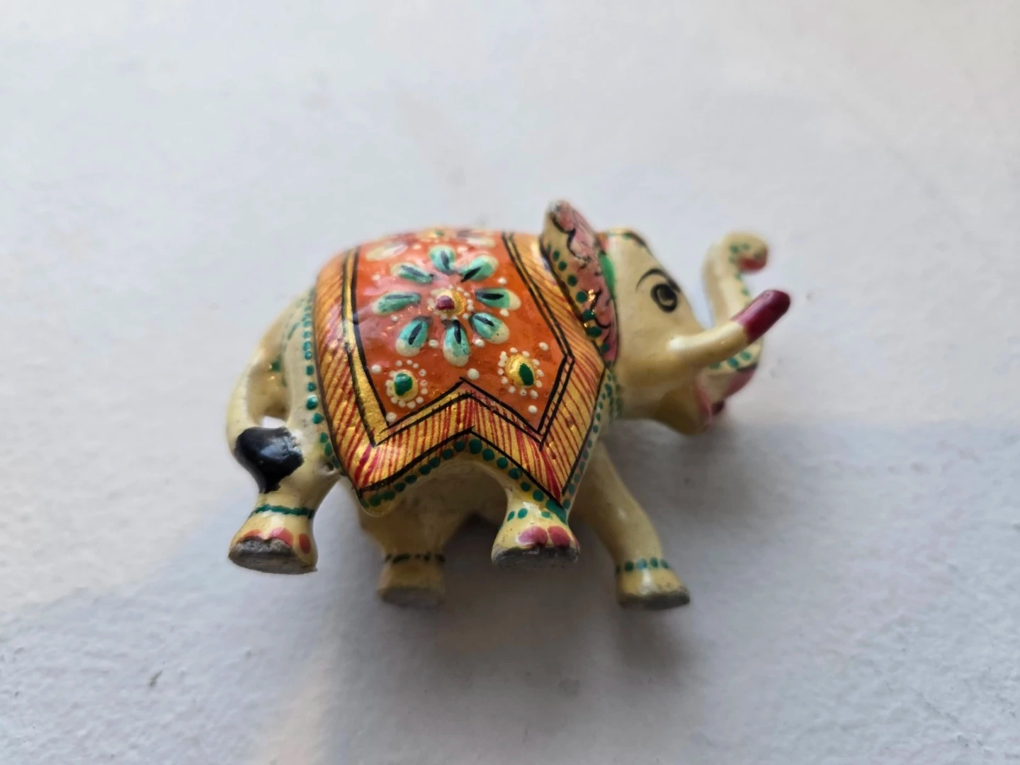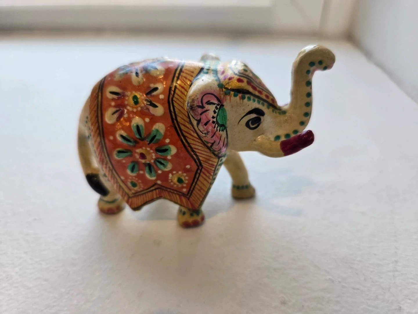 A charming decorative elephant figurine with intricate, colorful hand-painted details. It's made of a solid material and features traditional Indian motifs. Its size is perfect for display on shelves or desks!