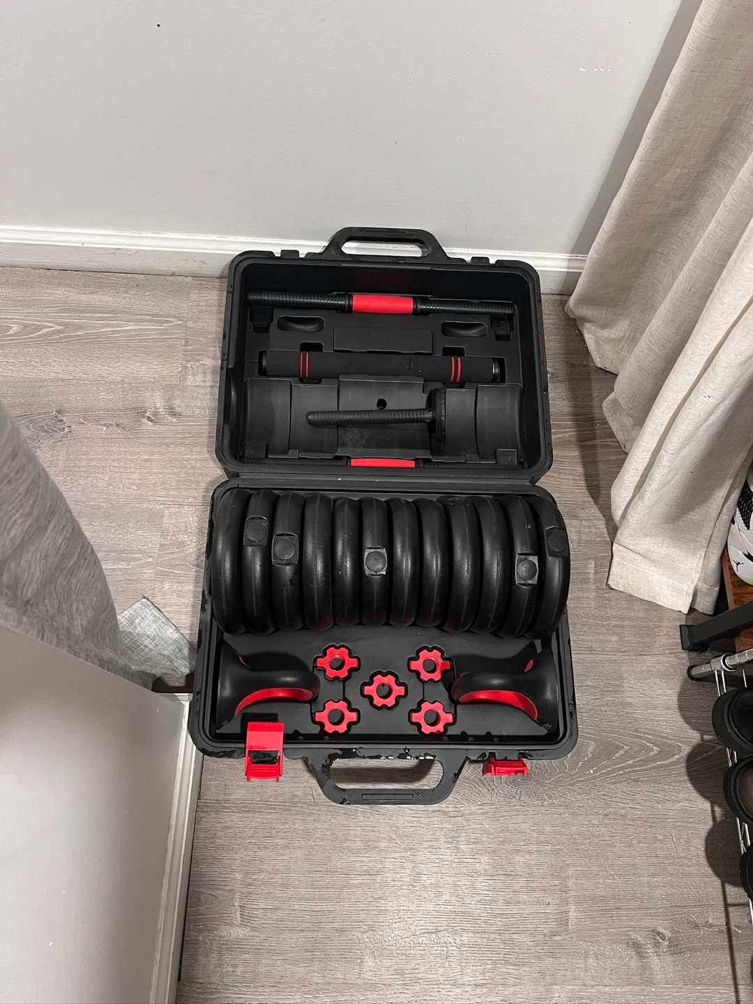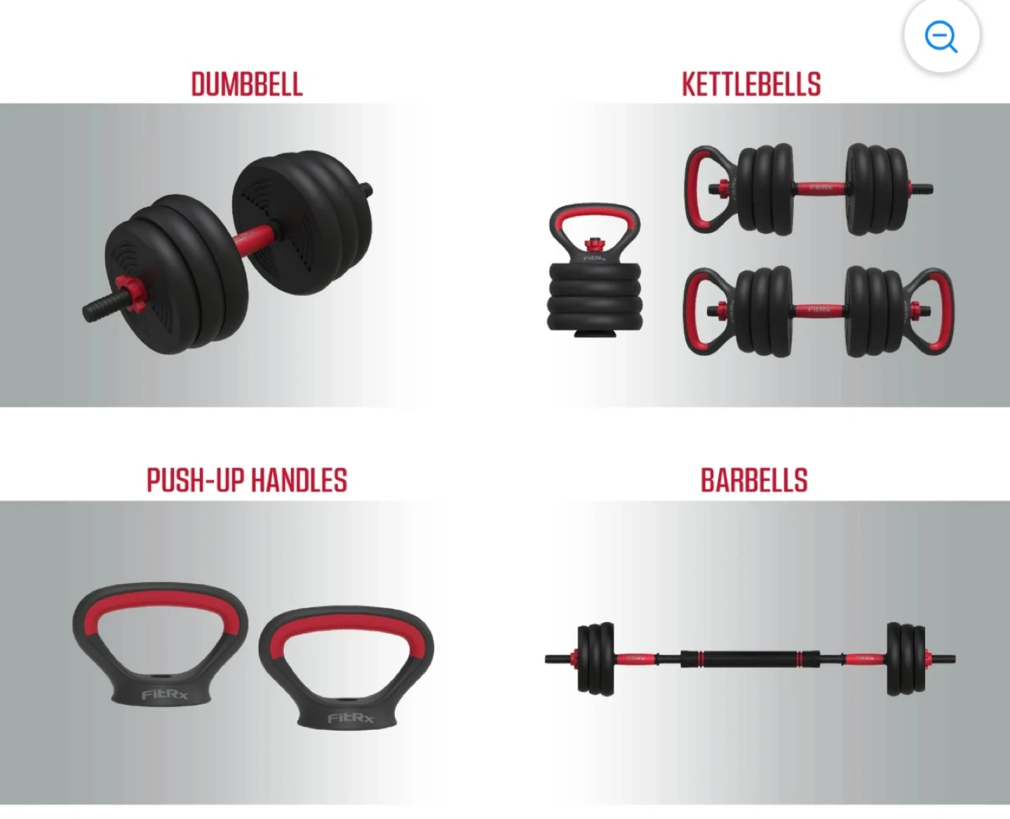This set includes adjustable dumbbells, kettlebell handle, and barbell connector. It comes in a convenient carrying case. Weights are adjustable up to 60lbs total. These are great for home workouts!